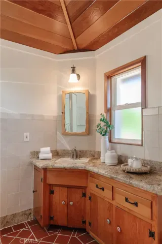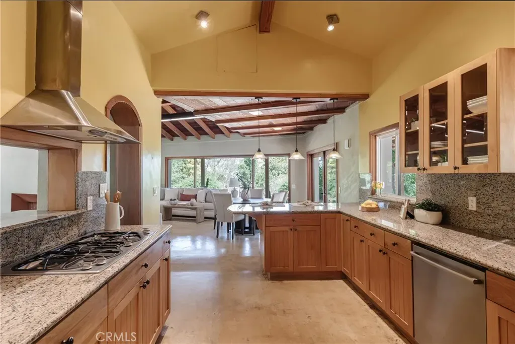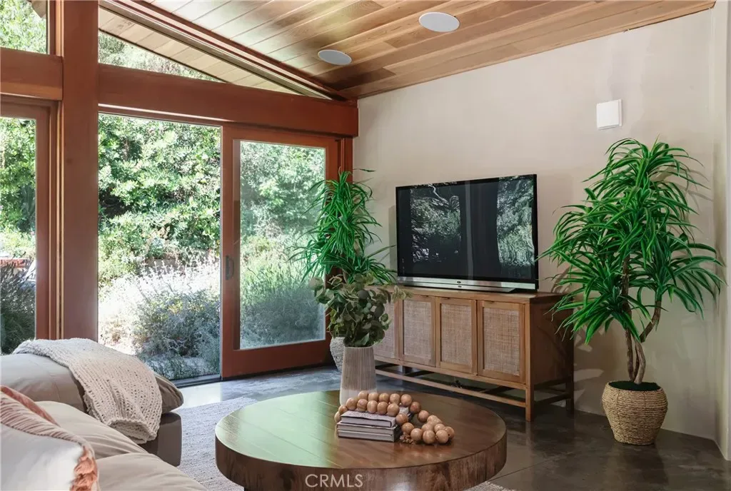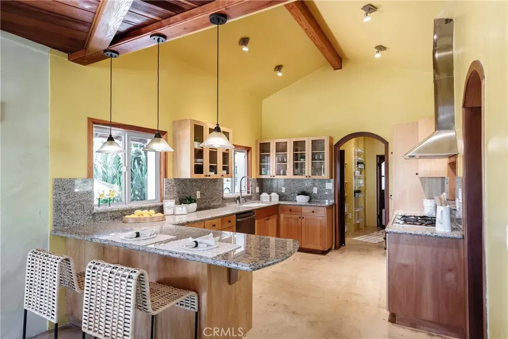 Outside is an organic food lover or vegetarian’s dream. Imagine mornings spent harvesting your own fruit & evenings cooking fresh vegetables from the raised garden beds. Practice yoga on the wrap-around covered porch or BBQ & dine al fresco on one of the outdoor patios. Walk thru the thriving edible landscape of 60 mature fruit trees. Head up the hill behind the home to swing from a tree, experience fireworks across the LA basin, witness snow on the mountains, or watch sunset color the coast & illuminate Downtown skyscrapers.