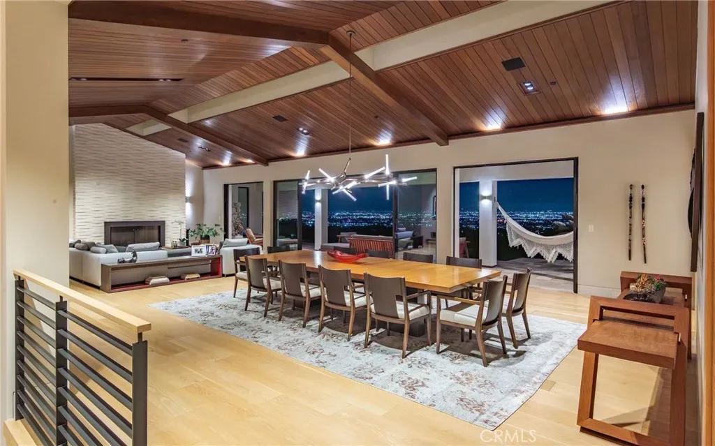 38 Saddleback in Rolling Hills is an architectural triumph, a 9,400-square-foot Contemporary Ranch nestled on a sprawling 54,732-square-foot lot. Designed by Criss Gunderson with inspiration from Cliff May, the estate’s positioning was guided by two Feng Shui masters to ensure a perfect harmony with its environment. This intentionality is matched by an uncompromising commitment to natural materials, featuring Italian Limestone floors, handmade oak and walnut doors with Rocky Mountain hardware, and the same Hope steel doors found at the Getty Museum. The home offers a dual-kitchen experience designed by Cooper Pacific of Beverly Hills: a sleek contemporary kitchen equipped with Gaggenau and Miele appliances and a “Entertainment Kitchen” featuring a handmade La Cornue stove, a Wood Stone pizza oven, and 150-year-old reclaimed barn beams. For the entertainer, the dining room is anchored by a Lindsey Adelman chandelier, while the lower level reveals a Cinema de Cuore theater with custom Fortress seating and a wine cellar constructed from recycled French castle stones and wine-barrel wood.