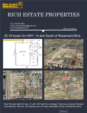 25+/- acres right On Hwy. 14 with 1327 feet Hwy. frontage. A small portion of the property produces $31,827.00 income/year from solar, and the income will increase by an additional 3.5% beginning March 1st of each year. Seller to provide the schedule of income upon approval of the offer and during the due diligence period. There is an expired tentative tract map No. 6443 for 120 Vesting Lots, that had some infrastructures improvements with curbs and gutters, etc… Flat buildable parcel with so many potentials, put your billboard sign or build a Truck Stop, Solar, etc… Absolutely beautiful South of Rosamond Blvd. There are homes to the North, South, and East of the subject property. New residential tracts in the area. Within a few miles is the world-famous Willow Springs Raceway. All utilities are in the street (including water). Just over the Los Angeles county line.