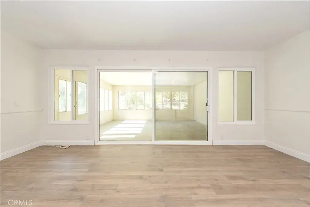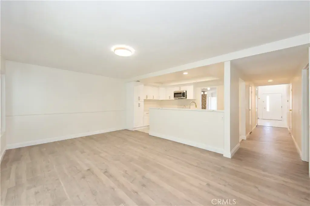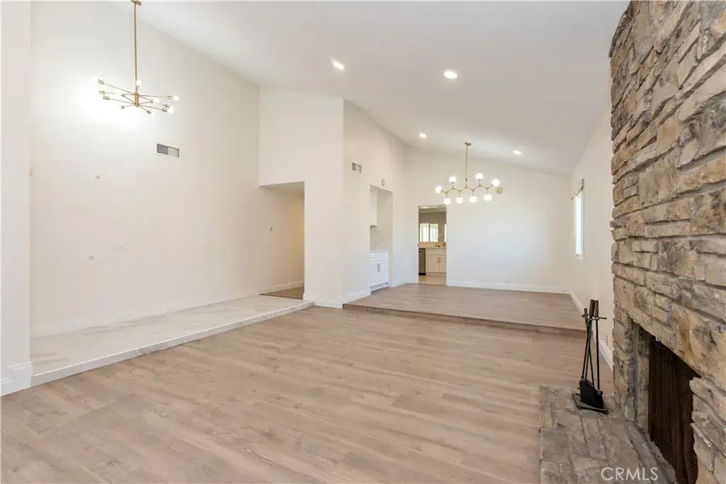 As you step inside, you’re greeted by vaulted ceilings and an abundance of natural light that fills the open-concept living and dining areas. The newly installed wide-plank luxury flooring adds warmth and continuity throughout, while recessed lighting and designer chandeliers elevate the ambiance.