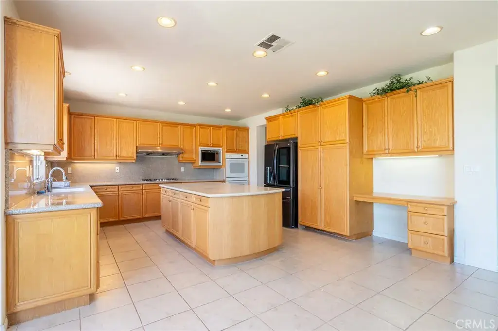 The spacious family room includes custom built-in bookshelves, while the chef’s kitchen showcases a large island, Corian countertops, built-in appliances, and a cozy breakfast nook.