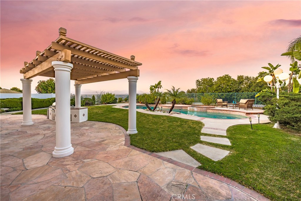 The beautifully landscaped backyard features a sparkling pool and spa, built in BBQ, patio, and gazebo, perfect for entertaining while enjoying gorgeous panoramic city lights and mountain views, including snowcapped mountains in winter.