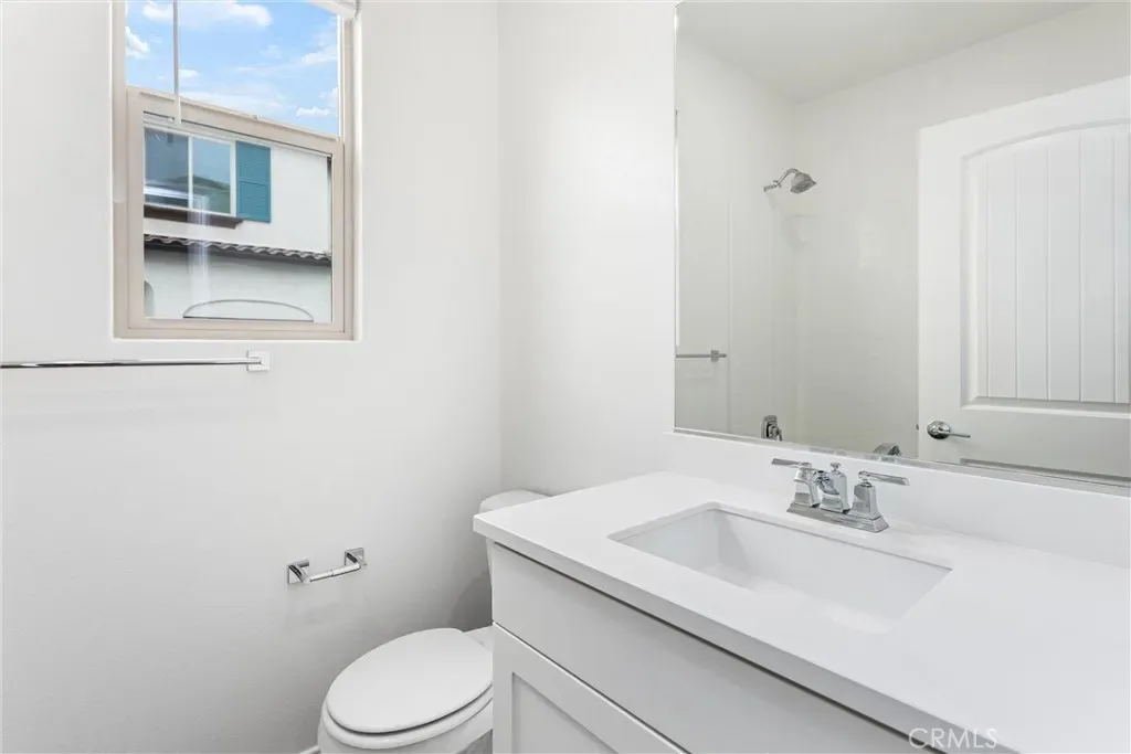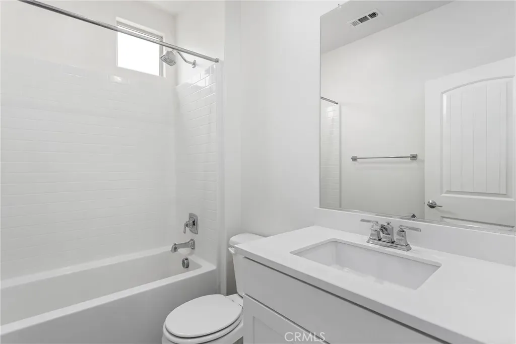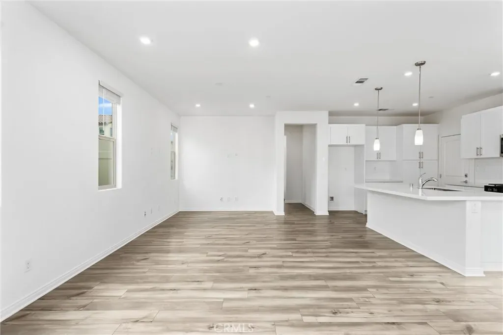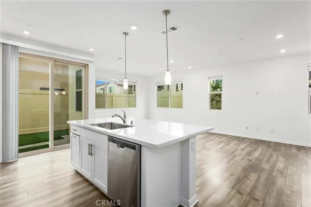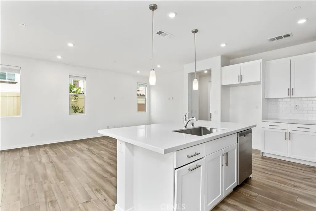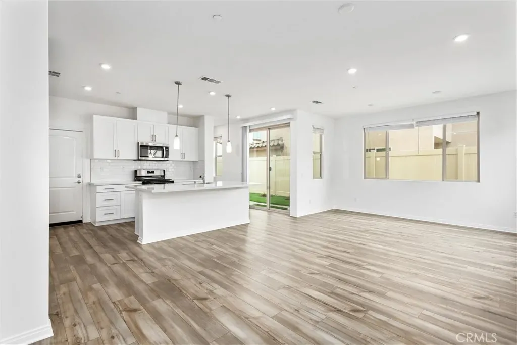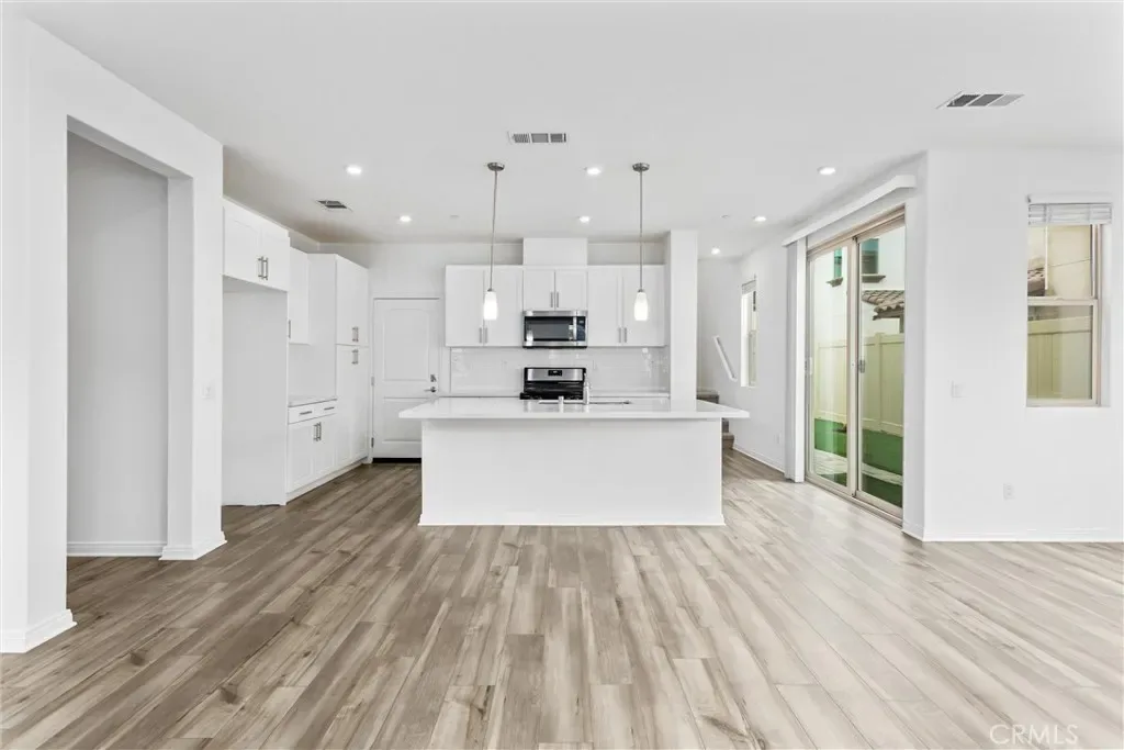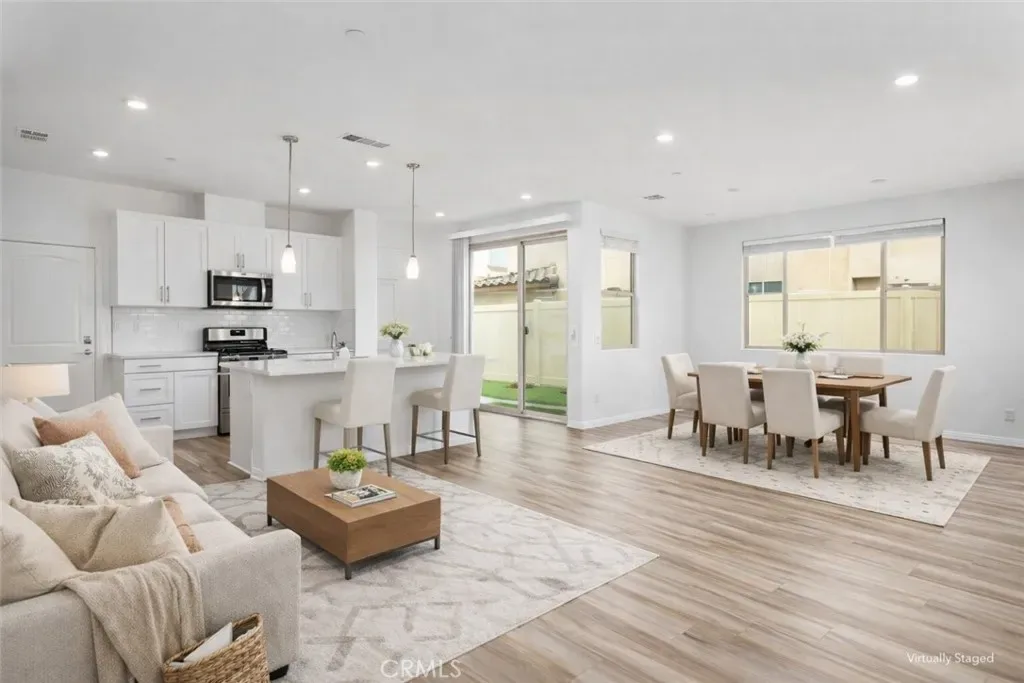 Step inside to an inviting great room at the front of the home, seamlessly blending the kitchen, living, and dining areas into one open-concept space—ideal for both everyday living and entertaining. The spacious kitchen is a true centerpiece, showcasing white quartz countertops, soft-close cabinetry, stainless steel appliances including a gas range, microwave, and dishwasher, along with convenient sliding door access to the backyard.