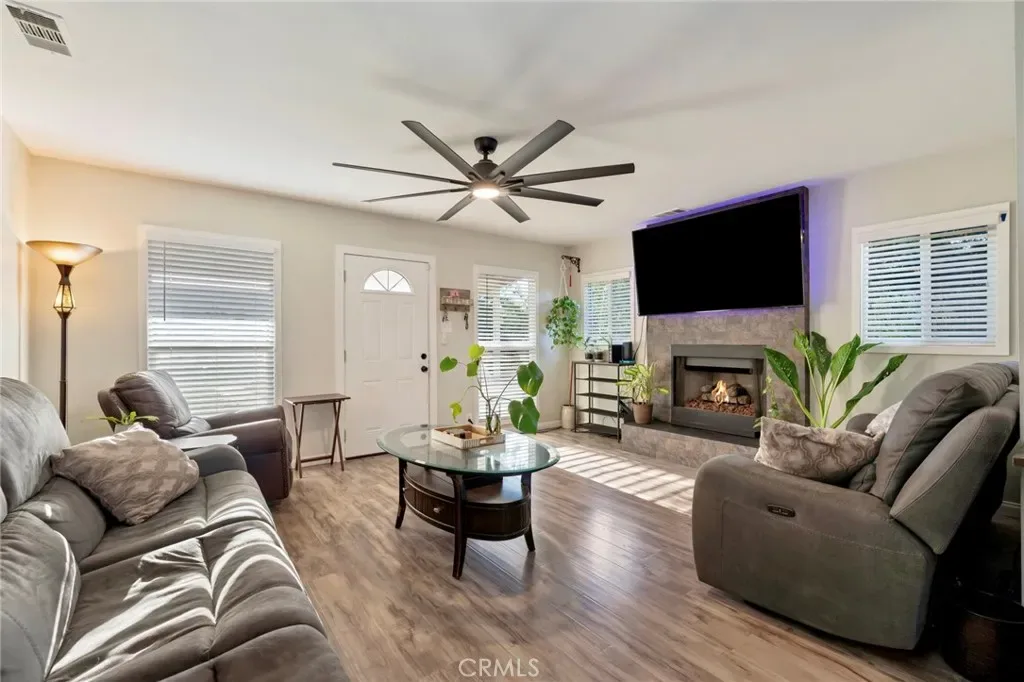 The inviting living room boasts a cozy fireplace, creating the perfect space to relax or entertain. Large windows fill the home with abundant natural light, enhancing its warm and airy feel with a view of mature trees in the neighborhood.