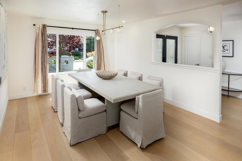 Stunning single-level home with mesmerizing, panoramic views of the Bay and hills of San Carlos. The property features effortless living, no steps and flat front, back, and side yards, creating a rare combination of accessibility and outdoor enjoyment. An expansive view deck, perfect for relaxing or entertaining while soaking in the breathtaking scenery. The outdoor space offers a built-in BBQ and stone patio, making it ideal for hosting gatherings against a spectacular backdrop. Beautifully updated in 2023, the light-filled interior has wide-plank light floors, quartz countertops, updated bathrooms, built-in closets, and restyled built-ins. A see-through fireplace with updated stone adds warmth and elegance between living spaces. The designer white kitchen is functional and sophisticated, featuring a Wolf cooktop, stainless steel appliances, and workspace. Spacious utility room with newer washer and dryer offers storage and convenience. Additional highlights include a two-car garage with epoxied flooring, solar system w/ battery backup, electric vehicle hookup, sink, and upper storage. This light, bright, and beautifully upgraded view home offers a rare opportunity to enjoy modern comfort, effortless indoor-outdoor living, and some of the most captivating views in San Carlos.