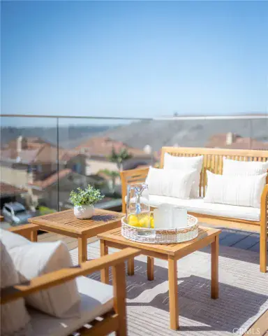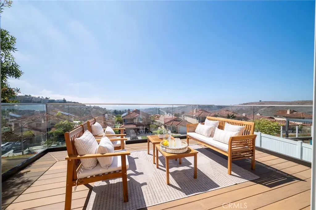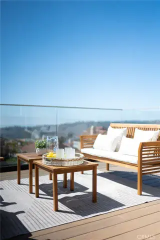 Around the corner, the timeless ocean-view kitchen is open to the family room and features quartz countertops, top-of-the-line stainless appliances, a wall of storage and a long breakfast bar. The family room offers a cozy marble fireplace, and you can step through the French doors to dine al fresco or enjoy morning coffee on the expansive back deck & new patio. In the backyard, the new frameless glass fence allows you to enjoy sweeping ocean & canyon views.