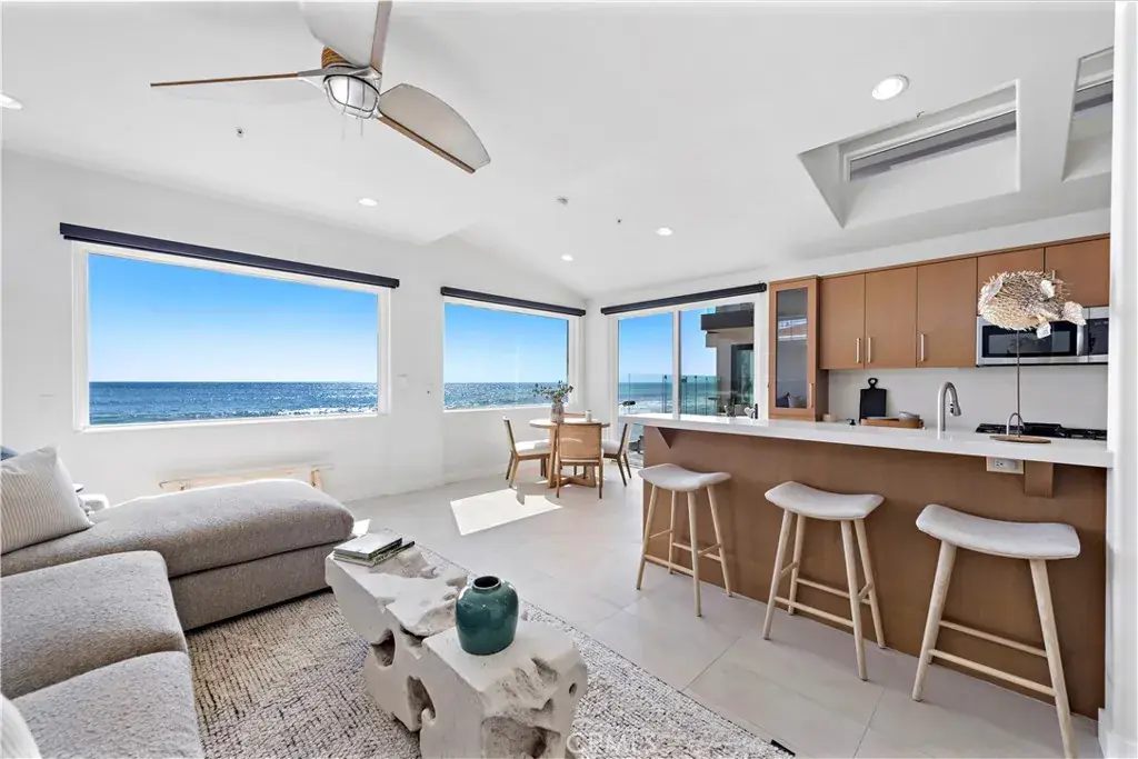 Set on the sand in the exclusive Capistrano Shores community, this rare double homesite offers ultimate California beachfront living, with panoramic whitewater, sunset, coastline, and beach views that stretch from the San Clemente Pier through the Headlands of Dana Point. Contemporary and highly upgraded, the main home provides four bedroom, four bathrooms, and the second home provides three bedrooms, 2 bathrooms. Lush outdoor space is equipped with security doors, tons of seating, a built-in BBQ and bar area, a storage area for all your beach accessories, and a partial glass enclosure for protection from the natural elements. The chic kitchen includes an oversized island, a large breakfast nook, a wet bar, and a full-size wine cooler with ample pantry storage space open to the well-appointed living room with a fireplace and security shutters to form a spectacular great room. Ocean views beyond comparison are throughout the open concept floor plan created by high ceilings, massive seamless windows, and stackable glass doors that lead to a spacious private courtyard. A laundry room, a bonus room, a three-quarter bath, a bedroom, and a powder room, both offering outdoor access, complete the bright and airy main level. The second level offers a large skylight, revealing a primary suite with panoramic ocean views, a windowed spa-like bathroom, a walk-in closet, and a deck with coastline views. Two additional bedrooms, a bathroom, a playroom equipped with a media stage, and built-in toy bins complete the second level. Additional highlights include porcelain tile flooring and wainscotting throughout, designer lighting and plumbing fixtures, electric window shades, security shutters, plantation shutters, multiple ceiling fans, A/C, built-in audio, golf cart parking, and four parking spots with an EV charging. Capistrano Shores is well located, with easy access to downtown San Clemente and its robust dining scene. Moments from scenic beach trails and community parks and located within an hour of most Southern California attractions. Experience the bliss of coastal living with this remarkable beachfront trophy property.