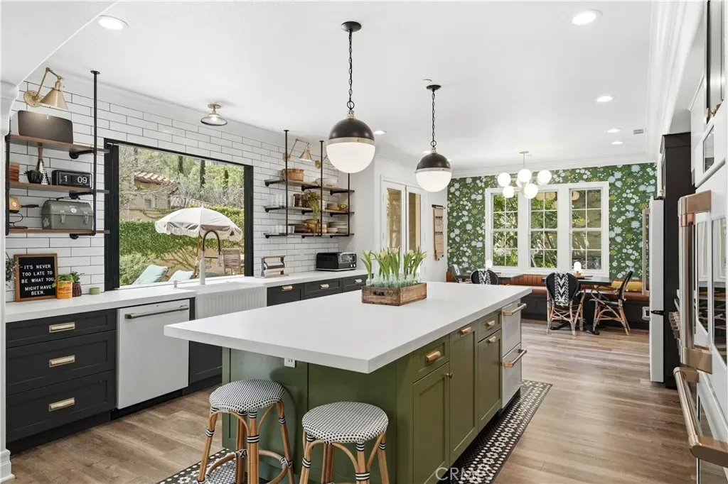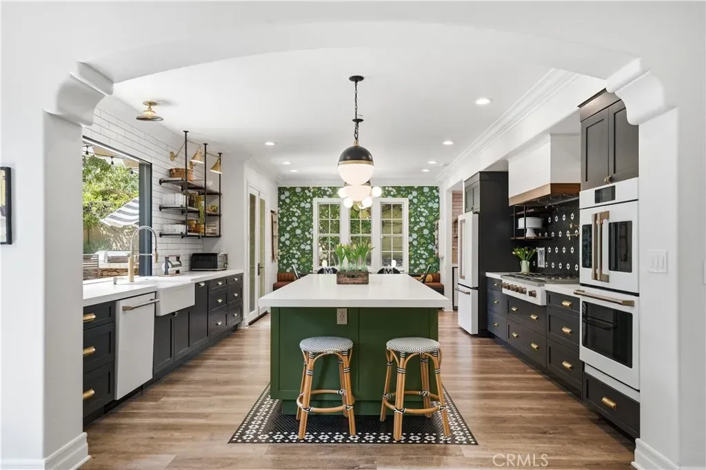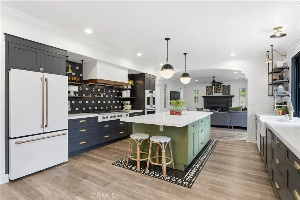 The fully remodeled chef’s kitchen serves as the heart of the home, thoughtfully designed with top-of-the-line Café appliances, including a 48-inch range top, double wall ovens, under-counter beverage center, and dual drawer refrigerator. A spacious center island and upgraded countertops create the perfect setting for both everyday living and elevated entertaining.