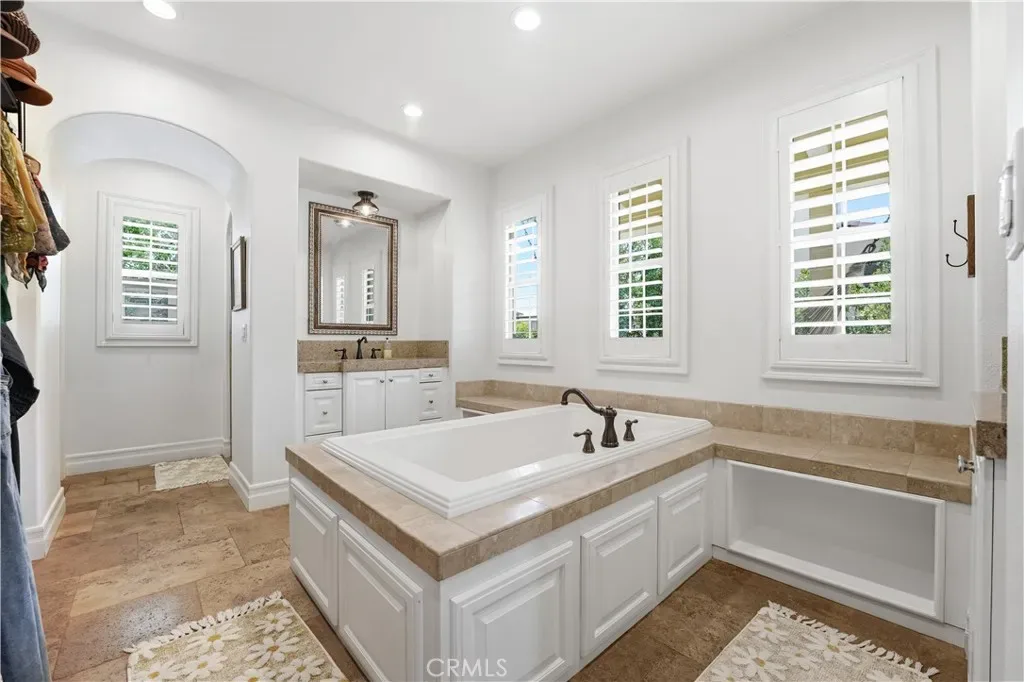 Designed for effortless flow, the formal dining and living areas open through French doors to a private interior courtyard adorned with custom stone features offering a serene and inviting retreat. The backyard is an entertainer’s dream, featuring a Turtle Bay pebble sheen pool with three water features, stone-accented decking, and a fully equipped outdoor kitchen complete with built-in BBQ, granite countertops, bar seating, and refrigeration.