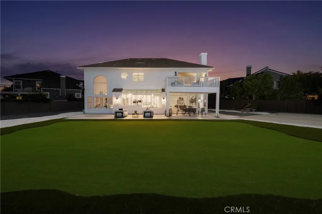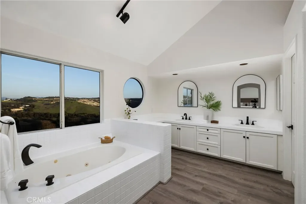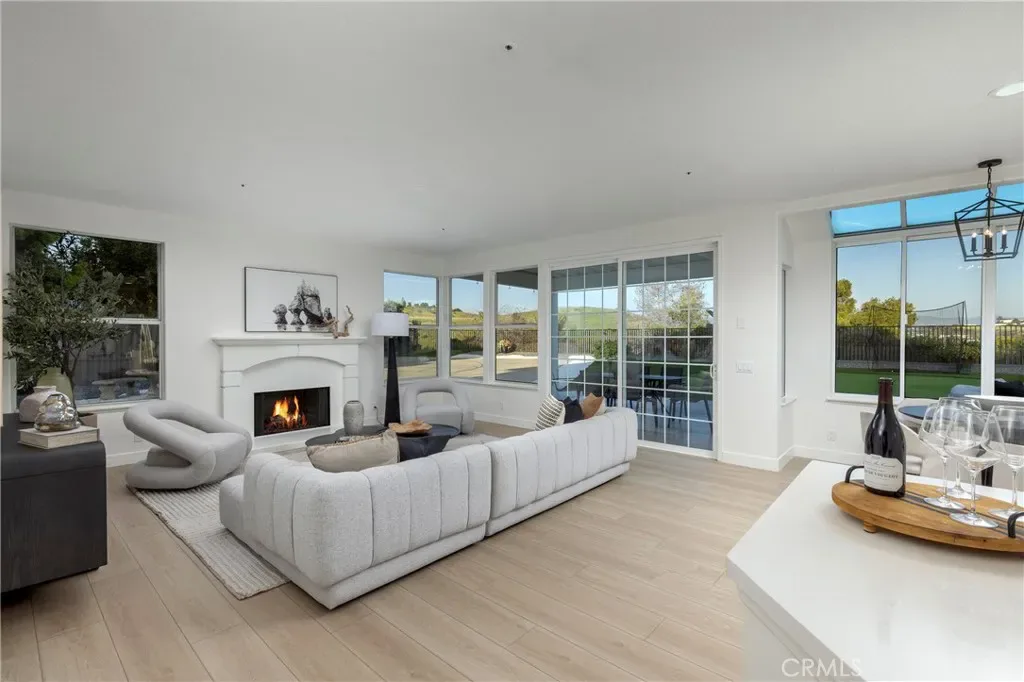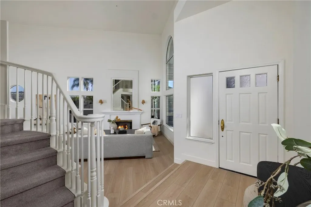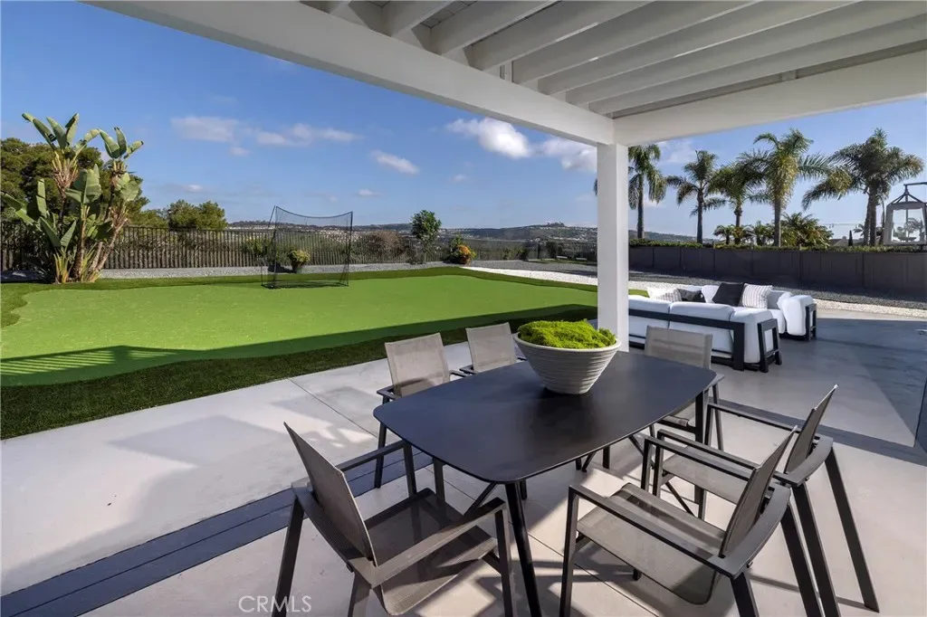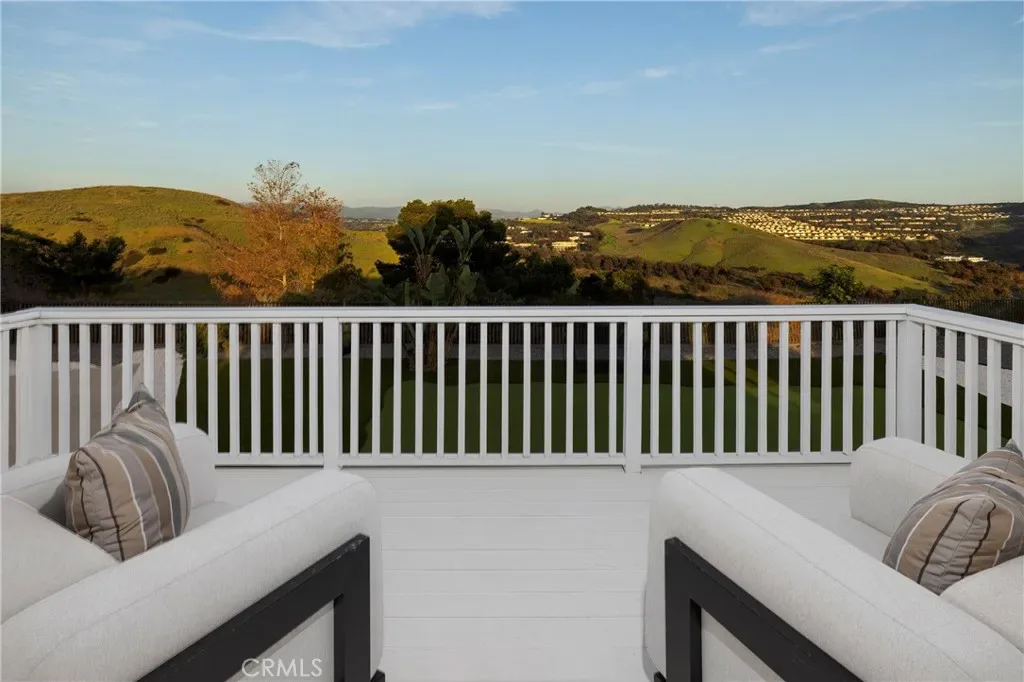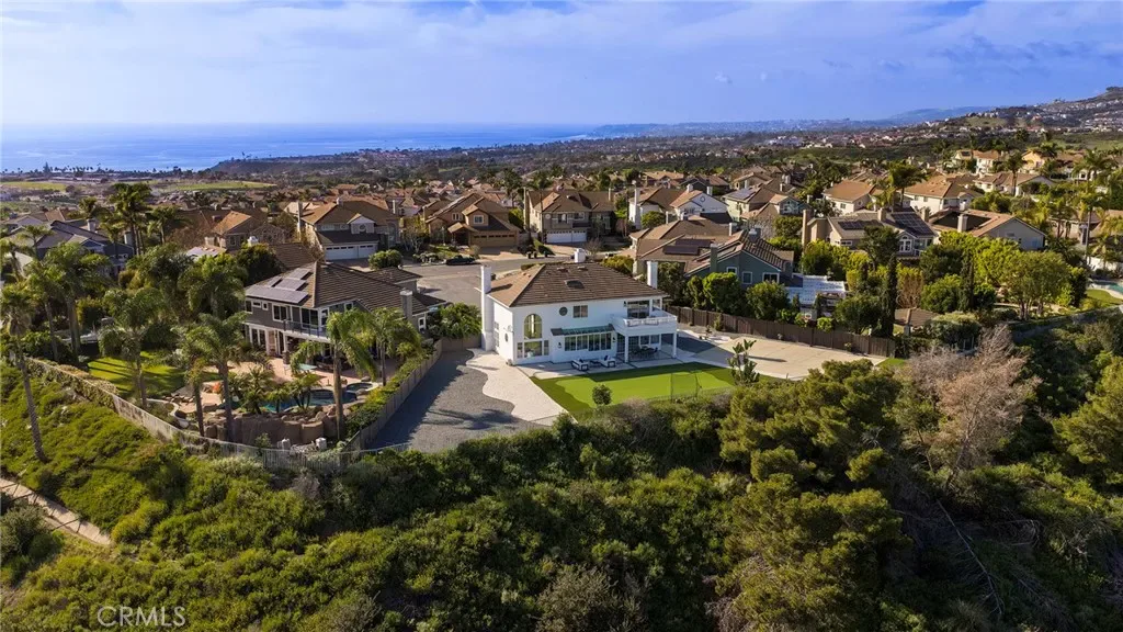 Spectacular home perched on a premium – flat lot, offering breathtaking canyon vista’s, city lights and peek-a-boo ocean views set within the 24 hour- Guard gated Community of Highland Light Estates. Welcome home to this quiet cul-de-sac street and this newly upgraded residence with 4 bedrooms and 3 full sized bathrooms – including a main-level bedroom offering flexibility for guests or office use. Upon entry you will be in awe of the soaring ceilings, floor to ceiling windows and brand new premium wood style vinyl flooring throughout. The grand picture windows bring light and views through the formal living and dining spaces creating a Wow factor as you entertain next to the grand fireplace. The chefs kitchen has Quartz countertops, double ovens, 5 burner island cooktop stove, walk-in pantry and plenty of counter space and storage with the wrap around cabinetry – perfect for entertaining with the adjacent wet bar. The light filled family room has a beautiful fireplace and sliding doors to the incredible .26 acre backyard with multiple lounge and entertaining areas for sunset gatherings of any size or a quiet space to unwind and take in the ocean breezes. The full sports court is complete with a Basketball hoop and half court, next to a putting green with turf grass for a low maintenance environment. Leading up the circular staircase you will find the enormous primary suite with high beamed ceilings, a step-up retreat with a cozy fireplace and an oversized balcony with ocean and Canyon Vistas. The en-suite bath has dual walk-in closets with custom built-in organizers, dual sinks, vanity area, jetted tub and a separate walk-in shower. Across the hall you will find 2 large secondary bedrooms with high ceilings, peek-a-boo ocean views and an adjoining full sized bathroom.