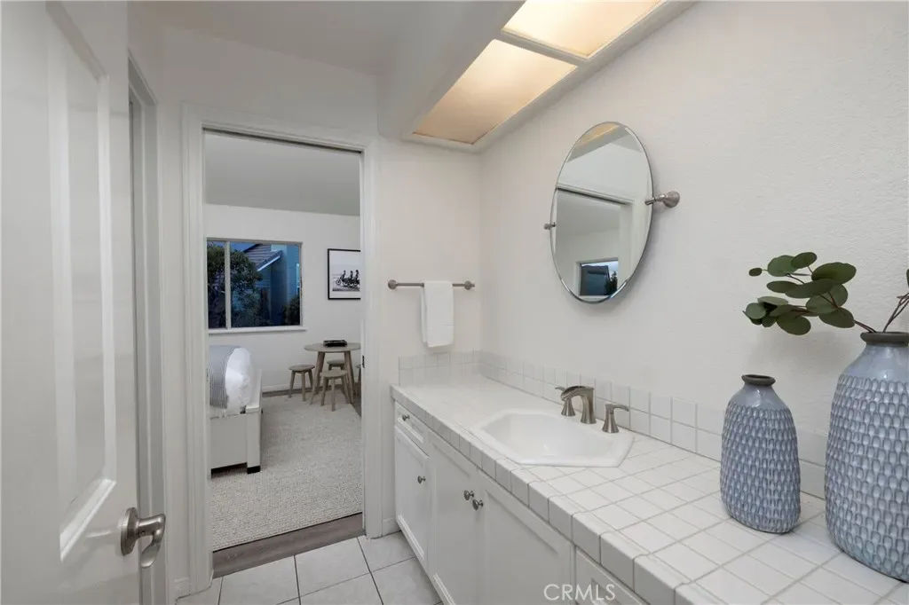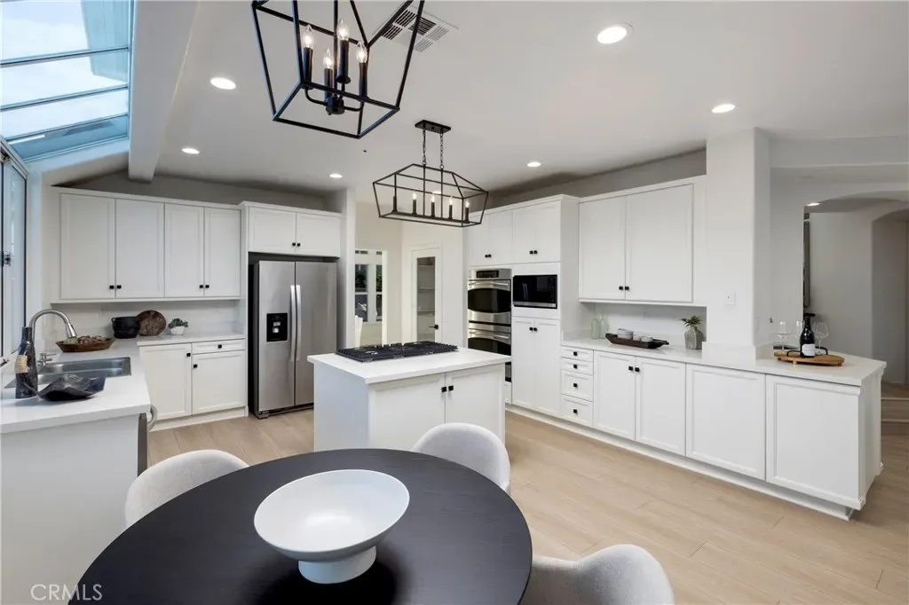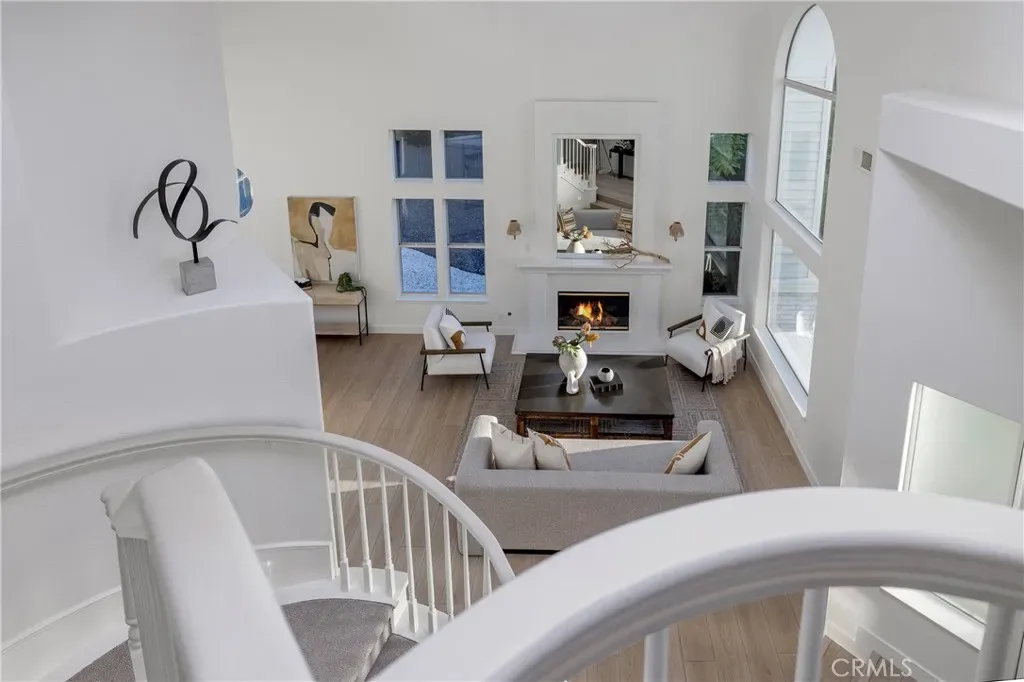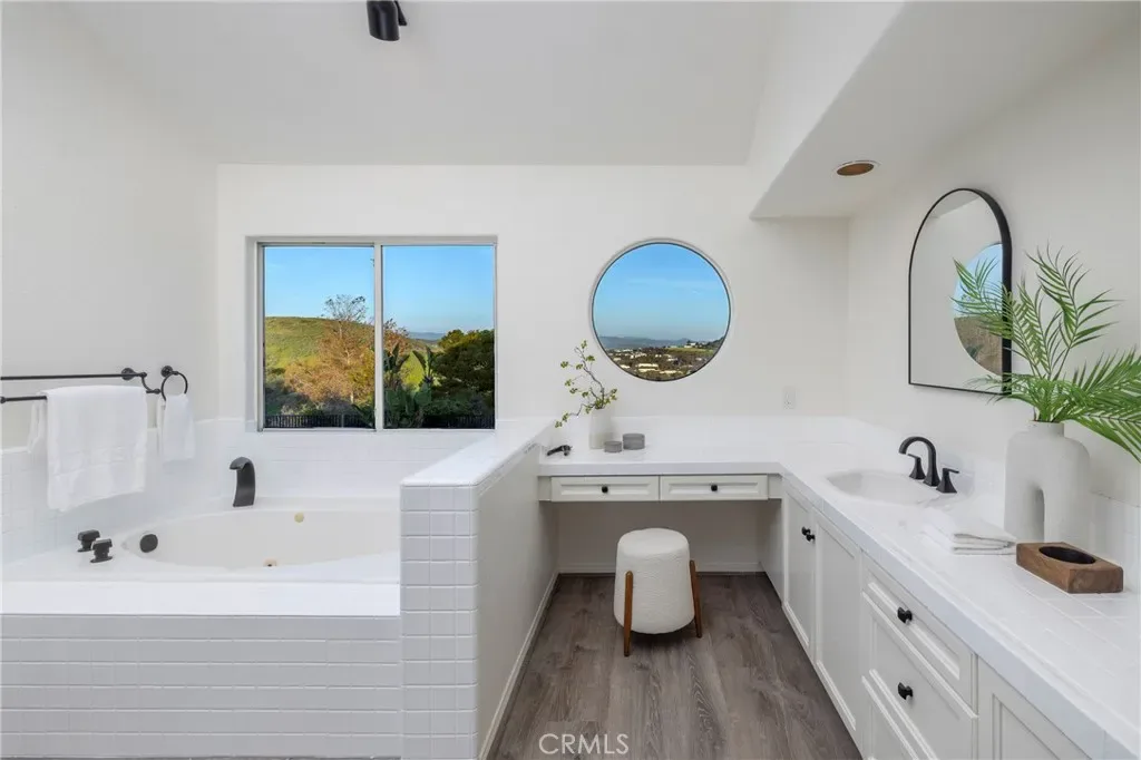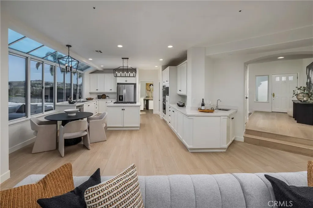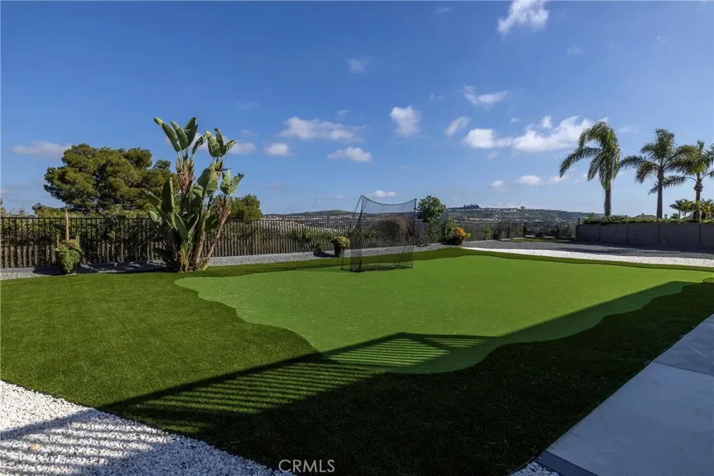 Spectacular home perched on a premium – flat lot, offering breathtaking canyon vista’s, city lights and peek-a-boo ocean views set within the 24 hour- Guard gated Community of Highland Light Estates. Welcome home to this quiet cul-de-sac street and this newly upgraded residence with 4 bedrooms and 3 full sized bathrooms – including a main-level bedroom offering flexibility for guests or office use. Upon entry you will be in awe of the soaring ceilings, floor to ceiling windows and brand new premium wood style vinyl flooring throughout. The grand picture windows bring light and views through the formal living and dining spaces creating a Wow factor as you entertain next to the grand fireplace. The chefs kitchen has Quartz countertops, double ovens, 5 burner island cooktop stove, walk-in pantry and plenty of counter space and storage with the wrap around cabinetry – perfect for entertaining with the adjacent wet bar. The light filled family room has a beautiful fireplace and sliding doors to the incredible .26 acre backyard with multiple lounge and entertaining areas for sunset gatherings of any size or a quiet space to unwind and take in the ocean breezes. The full sports court is complete with a Basketball hoop and half court, next to a putting green with turf grass for a low maintenance environment. Leading up the circular staircase you will find the enormous primary suite with high beamed ceilings, a step-up retreat with a cozy fireplace and an oversized balcony with ocean and Canyon Vistas. The en-suite bath has dual walk-in closets with custom built-in organizers, dual sinks, vanity area, jetted tub and a separate walk-in shower. Across the hall you will find 2 large secondary bedrooms with high ceilings, peek-a-boo ocean views and an adjoining full sized bathroom.