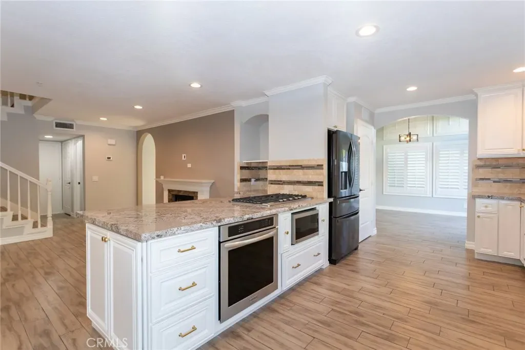 Welcome to this stunning fully remodeled 5-bedroom, 2.5-bathroom residence in the prestigious Marblehead gated community of San Clemente. This turnkey home features approximately 2,400 square feet of thoughtfully designed living space with premium finishes throughout. The interior showcases beautiful wide-plank luxury vinyl flooring, crisp white shaker cabinetry with brushed gold hardware, granite countertops, and plantation shutters. The formal living room impresses with a dramatic stacked-stone fireplace and crown molding, while the gourmet kitchen offers a center island with built-in gas cooktop, stainless steel appliances, and stylish subway tile backsplash. The spacious primary suite includes vaulted ceilings, a walk-in closet with custom built-in shelving, and a spa-inspired en-suite bathroom with double vanity, soaking tub, and shower. Four additional bedrooms provide generous space for family, guests, or home offices. The private backyard serves as a personal oasis with a custom stone spa, flagstone decking, mature palm trees, and low-maintenance landscaping. Additional features include a remodeled powder room, dedicated laundry space with washer and dryer, and a 2-car attached garage with epoxy flooring. The home is available April 1st at $7,195 per month with a one-month security deposit on approved credit. HOA fees are paid by the owner. Tenant is responsible for all utilities including spa maintenance and landscaping. Pets will be considered with additional pet rent and deposit.