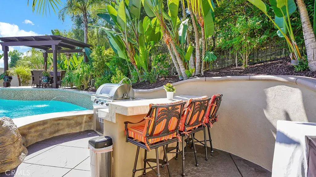 Exquisite Resort-Style Home in Talega’s Coveted Montellano Tract. Pride of ownership radiates throughout this stunning 5-bedroom, 4.5-bath, 4,423 sq. ft. home on an 11,325 sq. ft. lot. This two-story residence blends timeless elegance with modern resort-style living. A dual-step path framed by lush palms and landscaping leads to a gated courtyard with a built-in fireplace and seating area. Inside, the grand formal dining room overlooks the backyard, while the formal living room offers cozy carpet, a fireplace, and abundant natural light. Crown molding and light hardwood floors flow throughout the main level, creating an elegant, open feel. Downstairs features a stylish powder bath and a private ensuite bedroom—perfect for guests or multigenerational living. The gourmet kitchen is the heart of the home, showcasing granite countertops, rich wood cabinetry, a Sub-Zero refrigerator, Viking double ovens, stovetop and hood, dual dishwashers, pantry and a large island with seating and open shelves. A separate breakfast nook complements a butlers pantry with a dedicated coffee/bar. The adjoining family room offers custom built-ins, fireplace, and shuttered windows overlooking the backyard, plus direct outdoor access. A generous laundry room with cabinetry, sink, and counters connects to the three-car garage with new epoxy flooring. Upstairs, elegant white patterned carpet flows throughout. The primary suite features a fireplace, private balcony with retractable awning, and a spa-inspired bath with dual vanities, soaking tub, walk-in shower, and remodeled his-and-hers custom closet. Three additional bedrooms include two ensuites (one with its own balcony) and a third near the spacious loft—ideal for a playroom or office. The hallway includes built-in cabinetry, and all upstairs rooms feature plantation shutters. The resort-style backyard is a showstopper: a sparkling pool with multiple water features, bar seating, and a lazy river leading to a waterfall. A bridge crosses the water to the built-in BBQ area with bar seating, while stairs lead up to a tiki hut with private dining, TV, and a cascading water feature into the pool. Multiple lounging and dining areas surround the pool, the side of the home has built-in garden planters and all planters have individual drip lines for easy care. Additional highlights: new tankless water heater, redone pebble-tech coated driveway, two new gates, new front door, stylish awnings and full exterior paint completed one year ago.