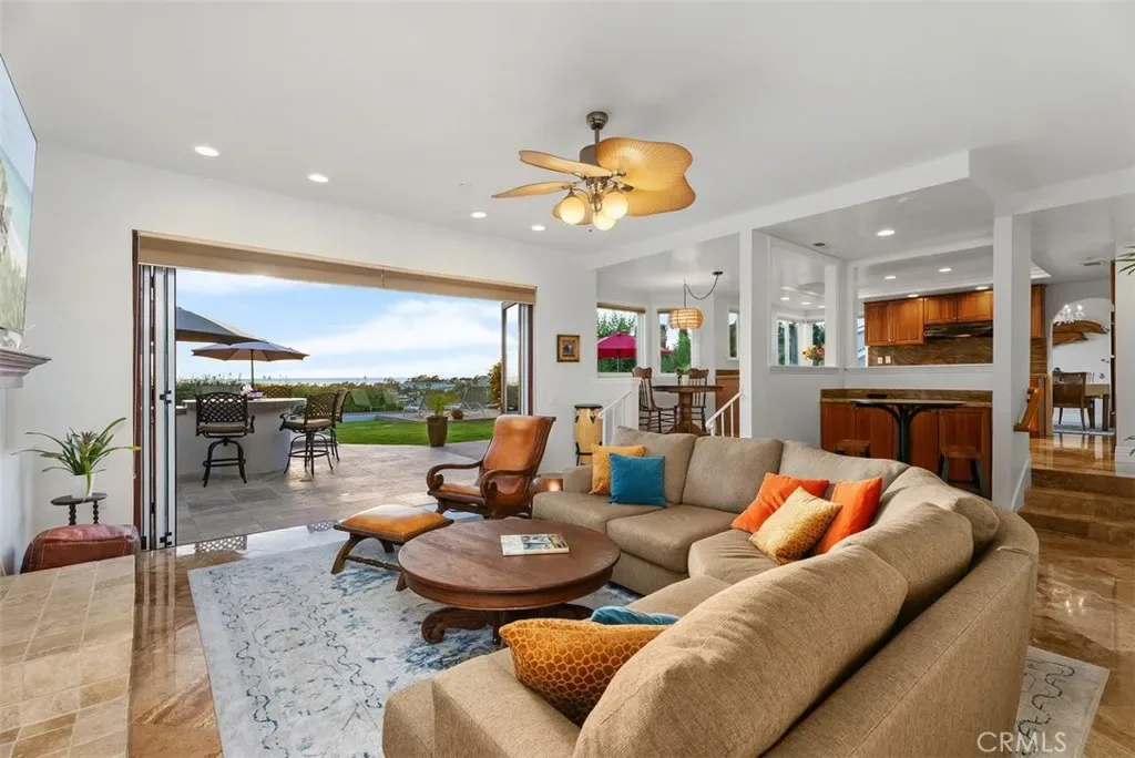 615 Calle Hidalgo features panoramic Pacific Ocean and Catalina Island views from the first and second levels. This coastal dream home is situated on a quiet cul-de-sac, on an extremely private elevated lot. The moment you enter the front door, you are greeted by dramatic high ceilings, with an ocean view dining room to your right, and a grand formal living room to your left, which includes a wood burning fireplace. The kitchen has been remodeled with granite counter tops, and exotic wood cabinets. The home has been upgraded with double pane windows, as well as the installation of a massive bi-folding door system which seamlessly connects the family room to the back yard. There is one main floor bedroom which makes a great home office or gym. You’re sure to be impressed by the oversized primary bedroom suite, which has a large sitting area, and an ocean view balcony. The primary bathroom and upstairs hall bathroom have been totally remodeled and are gorgeous. Additional recent upgrades include installation of HVAC system, new interior and exterior paint, as well as new carpet upstairs. After touring the interior, you’ll fall in love with the back yard, which features a built in BBQ center, large patios for outdoor dining and entertaining, and pads for lounge chairs. Past the rear glass fence you’ll appreciate the distance between the back yard and any nearby neighbors. This stunning home even includes a 3 car garage, and a large driveway. Conveniently located near the northernmost San Clemente freeway on-ramp/PCH makes this a commuters dream location. Super close to the beach and Shorecliffs Golf Course. Hurry, this one is going to sell fast.