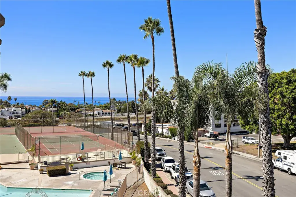 Perched on the top level of the Ocean Fairways community, this upgraded two-bedroom, two-bath home offers 1,326 square feet of single-level living and a rare vantage point over the lush fairways of the San Clemente Municipal Golf Course, with glimpses of the ocean beyond. Large windows and a spacious covered balcony draw in light and capture the home’s tranquil setting. Inside, a modern concrete fireplace with custom mantel anchors the open living area. The kitchen combines quartz countertops, subway tile accents, ample cabinetry, and breakfast-bar seating for effortless everyday use. The primary suite enjoys wide golf course views, a generous closet, and an updated bathroom with double vanity and walk-in shower. A secondary bedroom and full bathroom complete the layout, while a dedicated laundry closet adds everyday convenience. Residents enjoy a private, gated community with countless amenities — pool, spa, tennis courts, recreation lounge with kitchen and fireplace, fitness rooms with saunas, and secure building access. HOA dues include water, cable TV, sewer, trash, insurance, and exterior maintenance — offering exceptional value and low-maintenance living. The location is a standout. Set directly across from the San Clemente Municipal Golf Course, the home also offers easy access to Vista Bahia Park and San Luis Rey Park for outdoor recreation. Plus, it’s only .9 miles to Calafia Beach, 1.6 miles to downtown San Clemente, and a short ride to Trestles, one of Southern California’s most coveted surf breaks. Golf cart and e-bike accessibility make it simple to reach beaches, parks, shops, and dining, while the community’s price point offers a more attainable way to enjoy the coveted coastal lifestyle San Clemente has to offer.