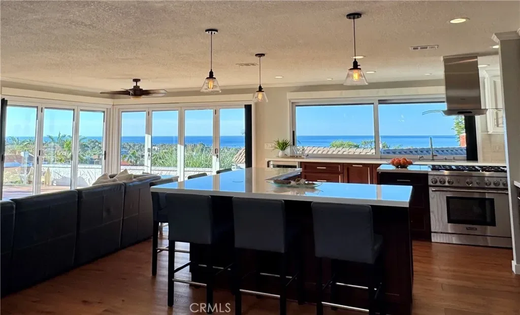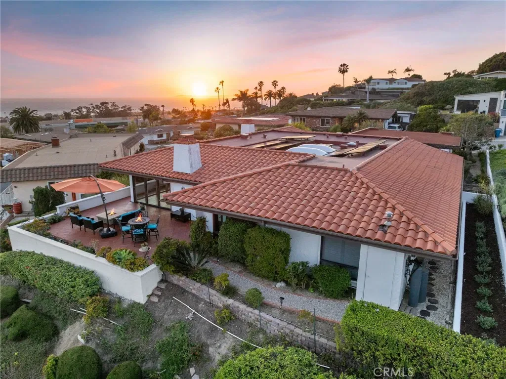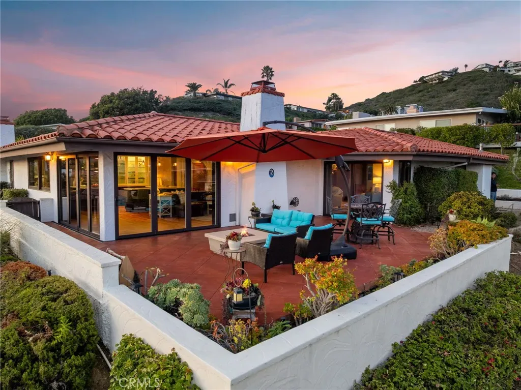 Experience panoramic OCEAN VIEWS from this beautifully designed spacious SINGLE STORY residence where open-concept living meets timeless Spanish architecture. Non-pass thru street, paid Solar and NO HOA make this a self sustaining choice. Incredible views of CATALINA ISLAND north, San Clemente Island west and La Jolla to the south. Designed for effortless entertaining, the chef’s kitchen showcases custom cabinetry, stainless steel appliances, a beverage refrigerator, and a custom wine room. Mediterranean engineered hardwood flooring flows throughout, complemented by marble accents & quartz countertops. Elegant pendant lighting, glass chandeliers, and fully dimmable custom lighting highlight the exceptional attention to detail. The front entrance showcases a tranquil floor fountain, original Spanish tile art, a lush pathway of ferns, palms, and flowering plants while original octagon pavers accent the driveway. La Cantina doors open the southwest corner of the home to a spectacular ocean-facing patio, seamlessly blending indoor and outdoor living. Enjoy morning coffee or evening sunsets beside the built-in gas fire table, pick fresh rosemary from the raised flower beds, and plant an additional garden on the south facing hillside. With only a few dozen homes, this street does not have pass thru traffic and is walkable to ILYA & SC Cafe. DOUBLE DOOR ENTRY, Spanish arches, a step-down living room featuring cathedral wood ceilings, and a cozy gas fireplace. The great room offers another stunning gas fireplace with wood mantle and a custom alcove housing a Samsung television and sound bar. A pop up electrical plug in the kitchen bar can transform the space into a surprisingly great work-from-home spot. The serene en suite primary includes dual sinks upgraded with neutral granite tones, a spa tub with a view, separate walk-in shower, and a walk-in closet. The large primary includes a seating area and sliding doors that open directly to the patio and sweeping OCEAN VIEWS! Energy-efficient dual-pane windows enhance comfort throughout the common areas and primary bedroom. ELECTRIC VEHICLE CHARGING STATION in the garage. OCEAN VIEW ASSURANCE in neighborhood tract deed. A rare opportunity to own a thoughtfully upgraded coastal sanctuary on almost one fourth of an acre where luxury, sustainability, and panoramic views converge. Price adjusted for buyer to perform any personal upgrades. Make an offer!