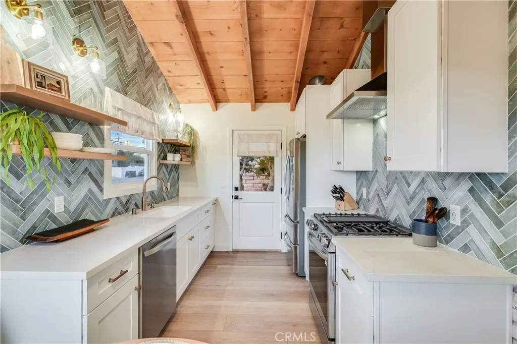 As you enter through the Dutch door, you’ll be welcomed by the spacious open-concept living room featuring a vaulted ceiling and a white-washed brick fireplace. Natural light floods the room through large west-facing windows. The kitchen is a culinary haven with stunning aquamarine herringbone tile walls and brand-new LG appliances. A delightful built-in dining nook complements the space. Step out to the expansive enclosed front patio for multiple seating areas and breathtaking sunset views. The bedrooms offer comfort and a bright coastal atmosphere with blackout options on the windows. The third bedroom is versatile, with French doors, dedicated working space, and additional storage. The bathroom boasts a walk-in shower, new vanity, and modern finishings. Enjoy the spacious backyard with a covered patio, seating area, fire pit, BBQ and beach gear! Parking is convenient with a long driveway for 2 vehicles.