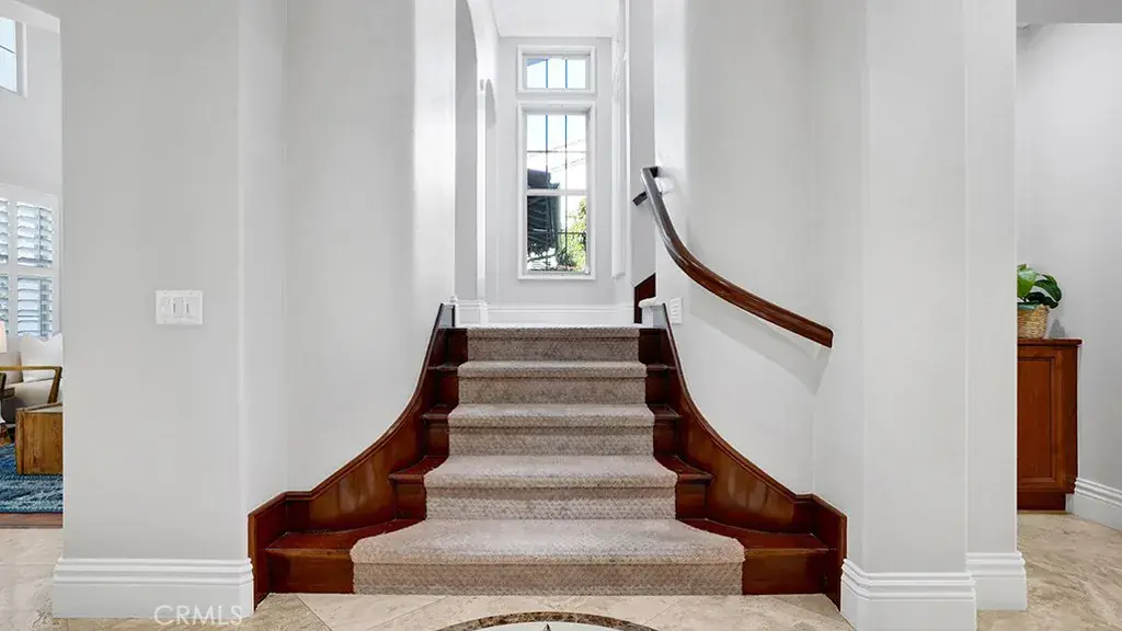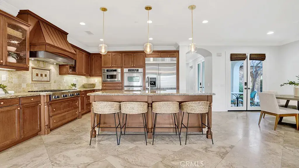 Step through the covered front porch into an elegant foyer that leads to a grand living room with cathedral ceilings, a cozy fireplace, and an adjacent office. The formal dining room opens to a covered terrace, creating a seamless indoor-outdoor flow. The gourmet kitchen features maple cabinets, high-end KitchenAid appliances, a built-in refrigerator, granite countertops, a double oven, an 8-burner stove, & an oversized island. The kitchen flows effortlessly into the nook and family room, which boasts a custom entertainment center and stunning views of the Talega hills. Additional main-level highlights include a pantry room, a craft room, and a versatile office space.