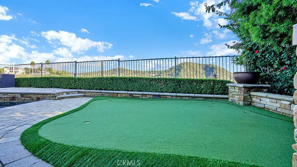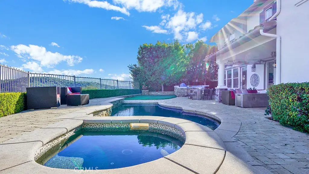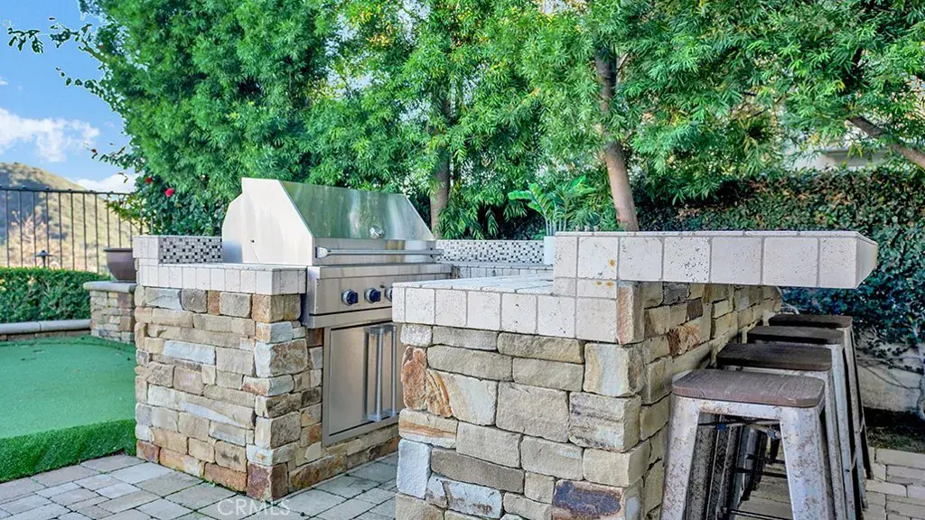 The resort-style backyard is an entertainer’s paradise, featuring a saltwater pool & spa, a Viking BBQ island, & a custom outdoor living room with a fully covered patio, with TV, fan, heater & recessed lighting. Custom pavers, a porte-cochere, a motor court offering 4 additional parking spaces, & an oversized three-car garage with epoxy flooring, EV charging setup, storage, and a workshop area. The home also has OWNED solar.