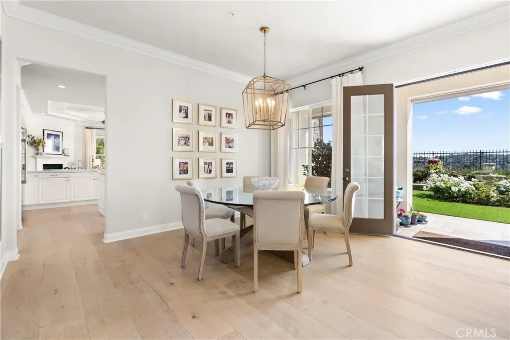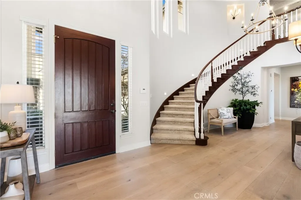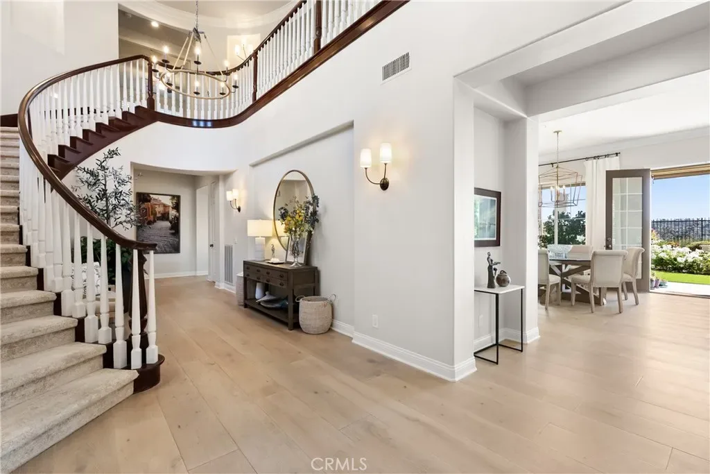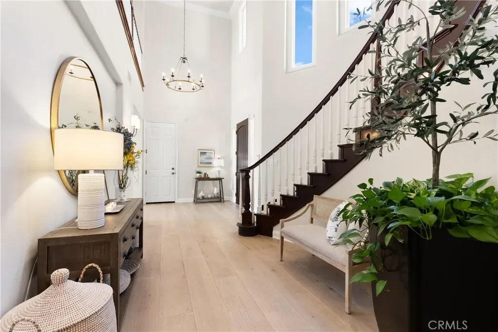 A grand two-story entry opens to beautifully curated interiors featuring crown molding, designer lighting, new hardwood flooring, and crisp white tones throughout. Formal living and dining rooms are filled with natural light and enhanced by French doors and a statement fireplace.