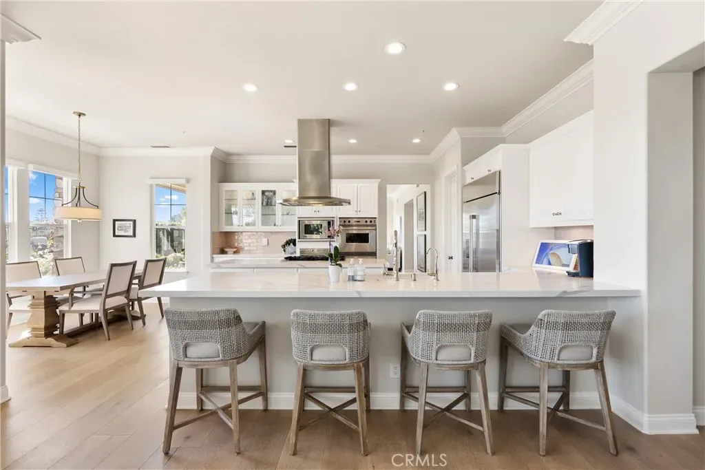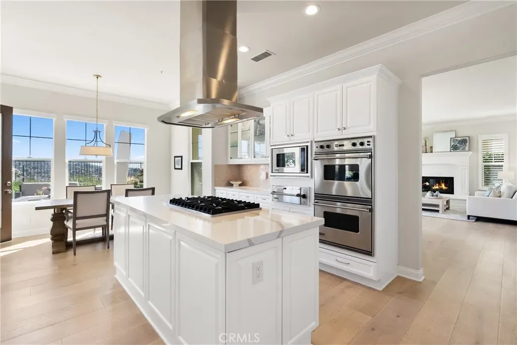The gourmet chef’s kitchen features quartz slab countertops, custom white cabinetry, a 6-burner range, warming drawer, and a large walk-in pantry. It flows seamlessly into the spacious family room with custom built-ins and fireplace, creating an ideal open-concept great room for everyday living and entertaining.