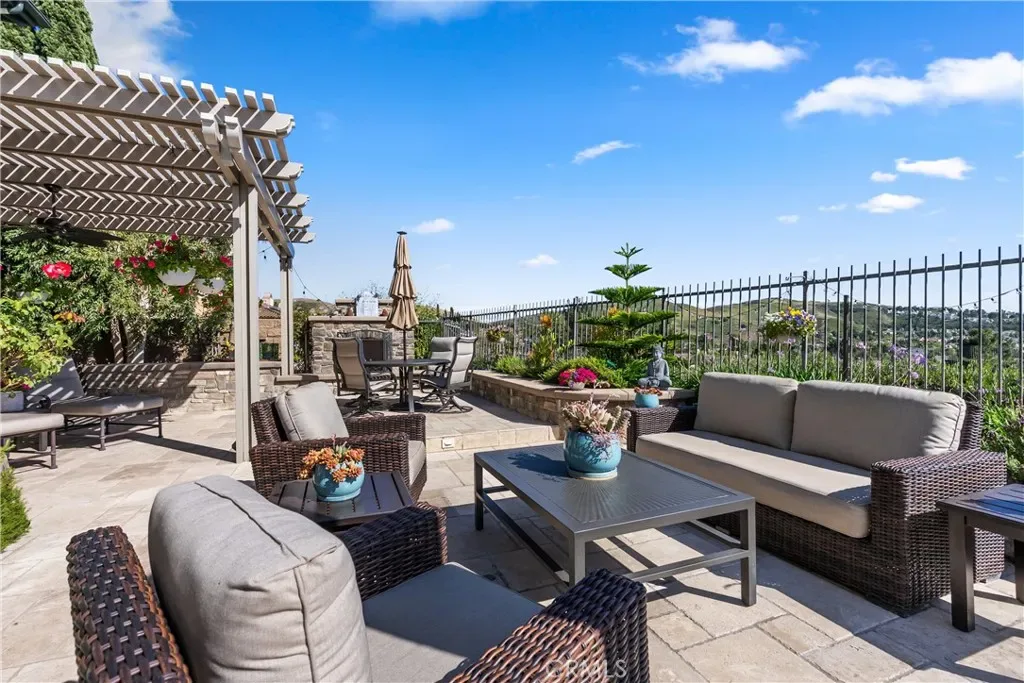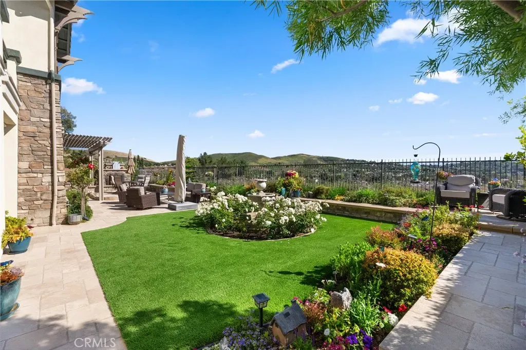 The resort-style backyard is designed for seamless indoor-outdoor living with a covered loggia, outdoor fireplace, built-in BBQ, and stunning panoramic views.