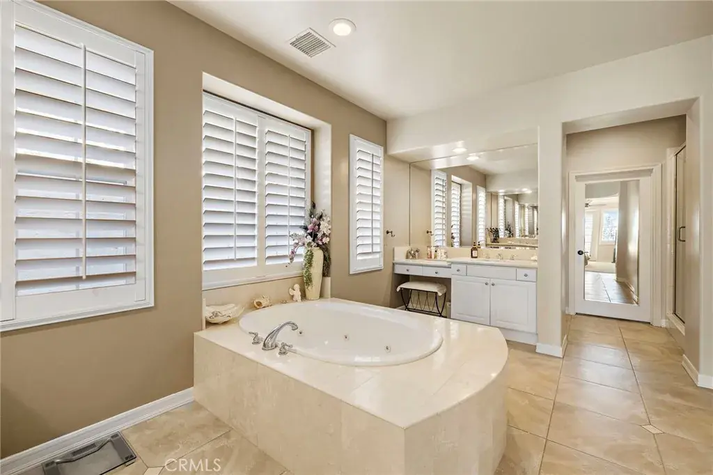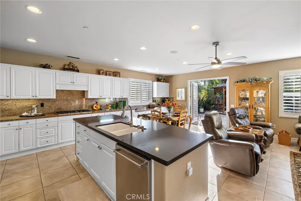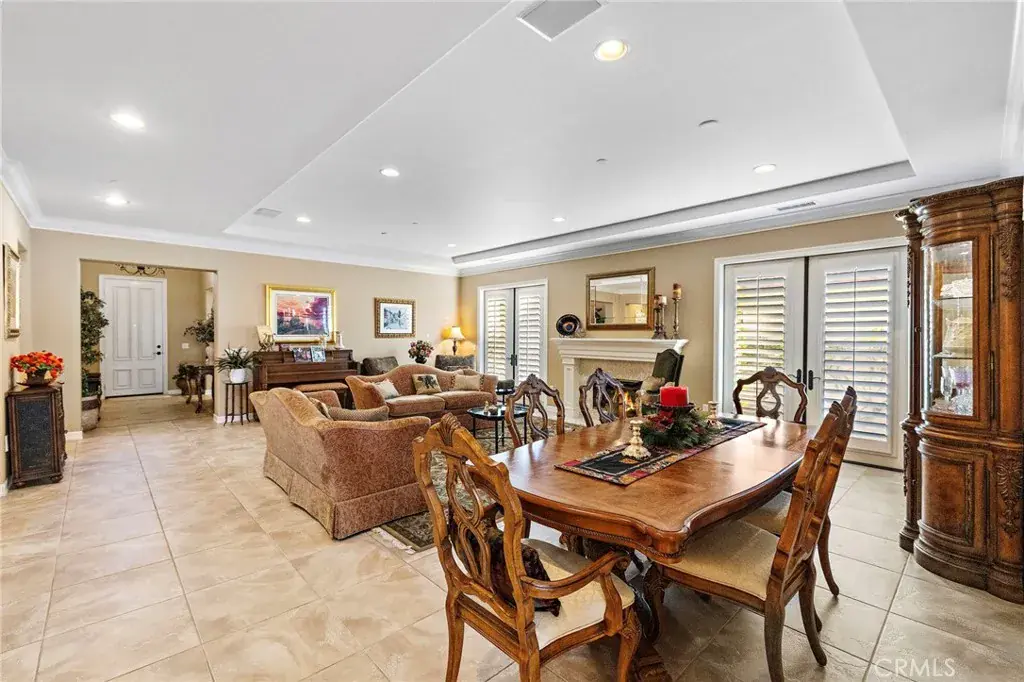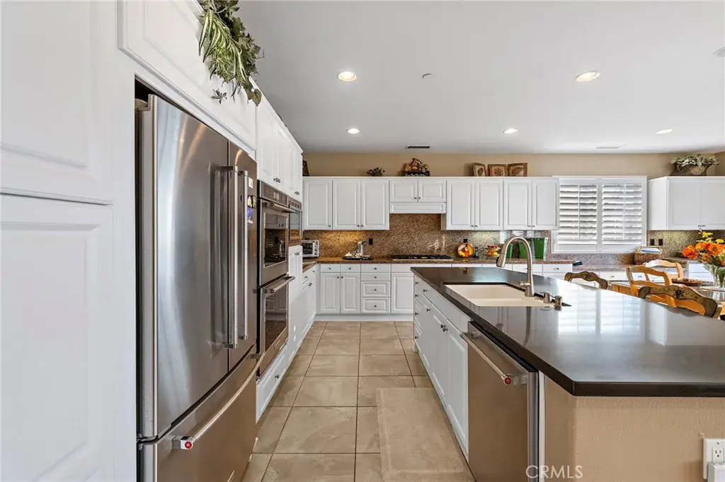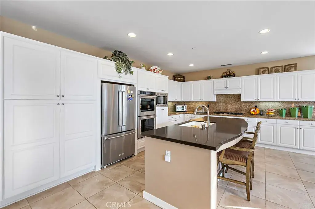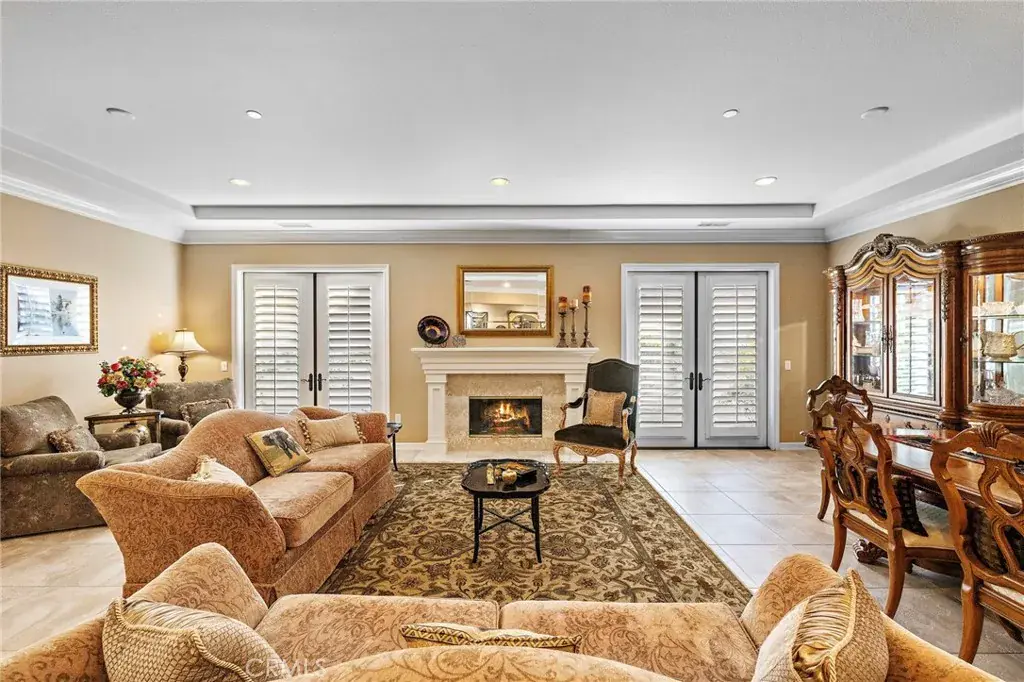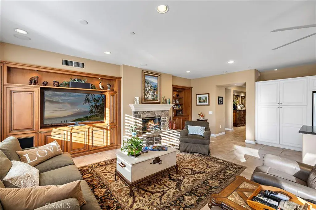 One of the community’s most preferred floorplans, the home features an oversized living and dining room with a marble fireplace and two sets of French doors, creating an inviting, light-filled space ideal for entertaining. The family room opens seamlessly to the kitchen, which boasts a large quartz island, generous dining area, refurbished cabinetry, and stainless-steel KitchenAid appliances. A custom built-in media niche and cabinetry adds both elegance and functionality to the family room.