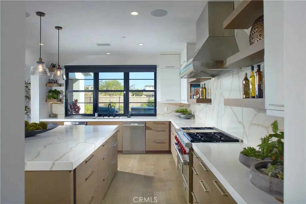 At the heart of the home, the chef’s kitchen is designed for both beauty and function, featuring white oak cabinetry, Cambria quartz countertops, Wolf and Sub-Zero appliances, dual dishwashers, an oversized island, and a separate prep kitchen for additional storage and convenience. Expansive folding doors connect the main living area to the California Room, where a fireplace, built-in speakers, and AV hookups set the stage for seamless gatherings and coastal living.