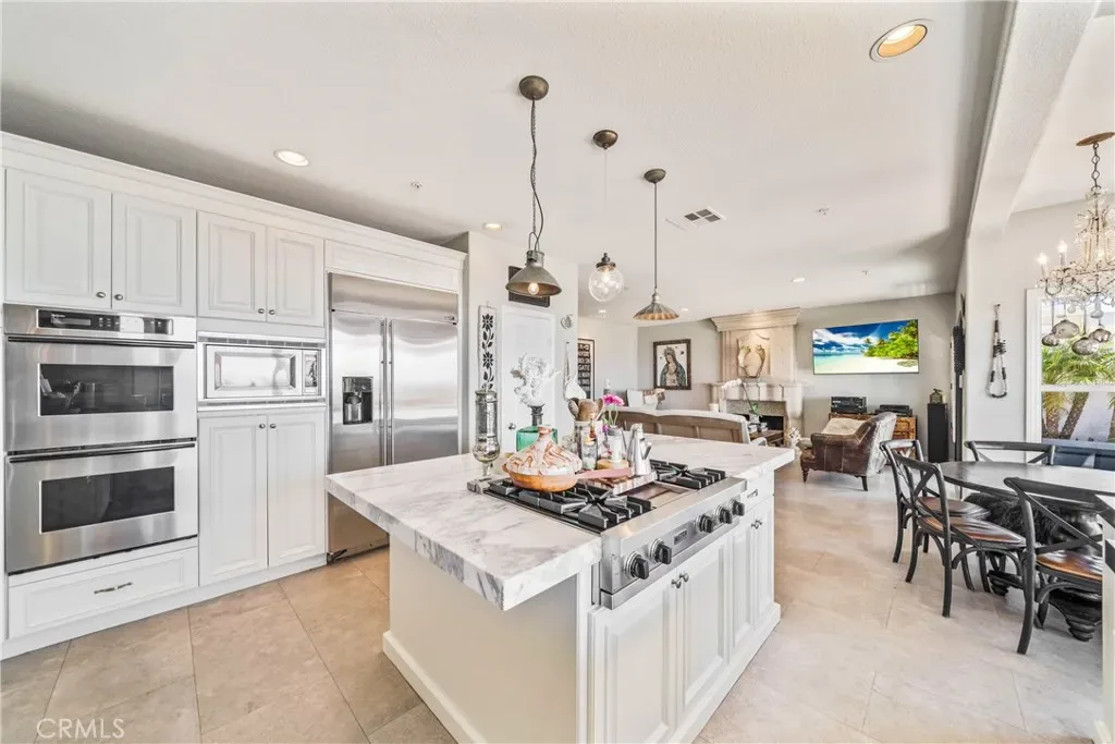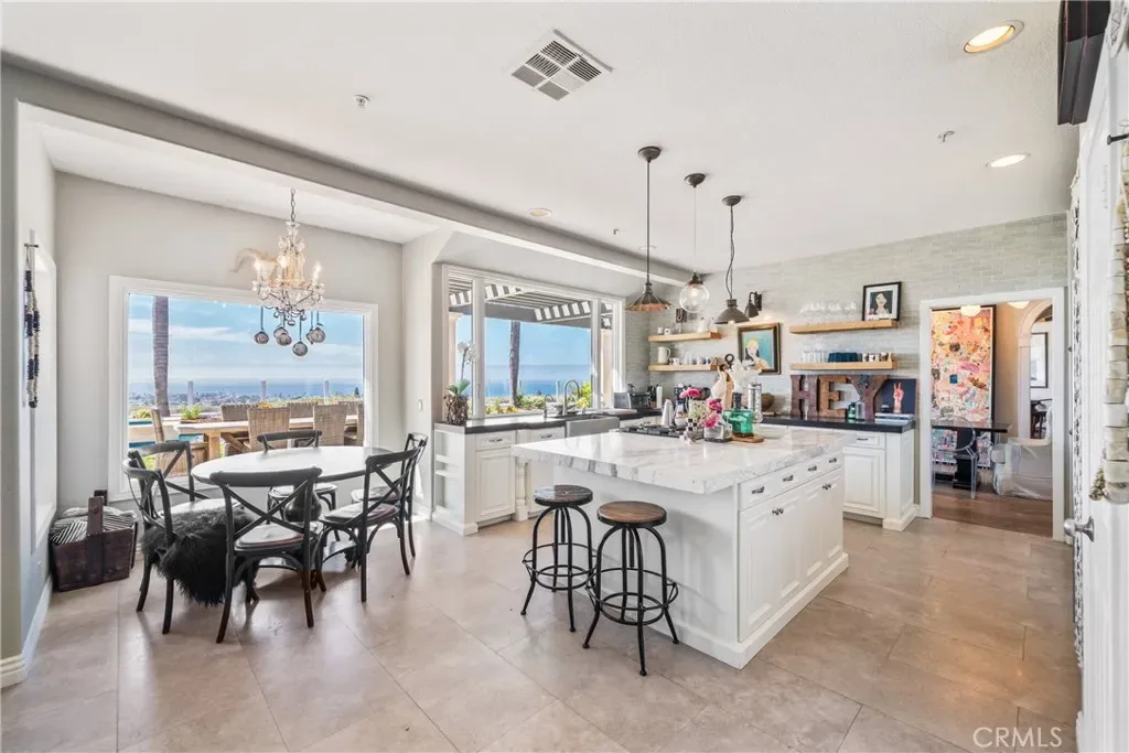 The eat in family kitchen is cooking, showcasing top tier appliances, a statuary marble island, honed black marble countertops, a large pantry and open wood shelving. Even the kitchen sink has amazing views. Off of the kitchen is a den/tv room with an amazing hand carved fireplace, wine fridge and more sit down ocean views.