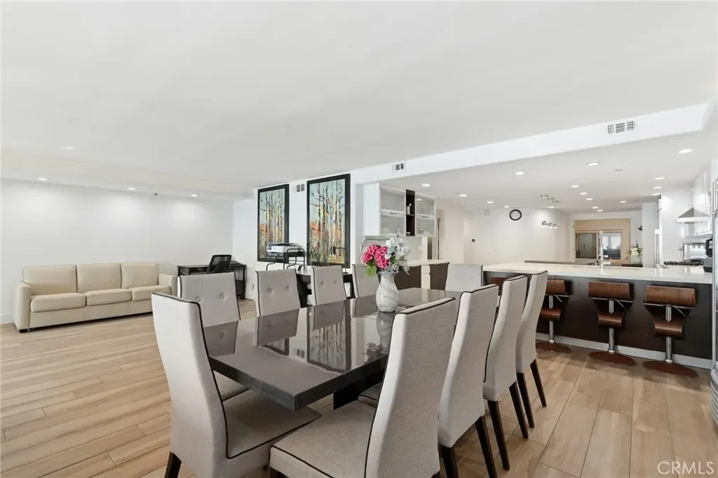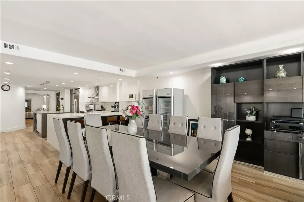 The gourmet kitchen flows seamlessly into the living area and is thoughtfully designed with high-end stainless steel appliances, a gas cooktop, quartz countertops, custom cabinetry, a glass tile backsplash, breakfast bar seating, and elegant tile flooring throughout.