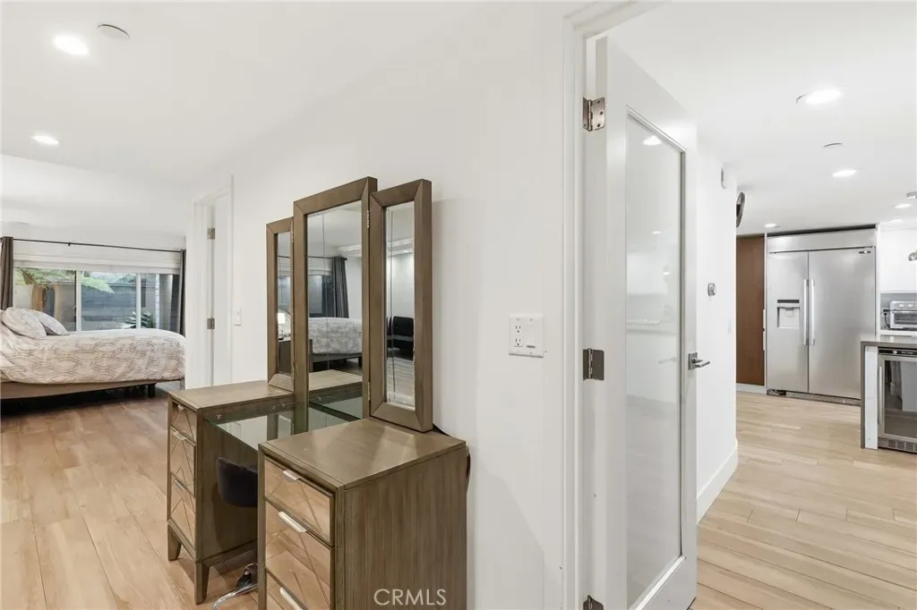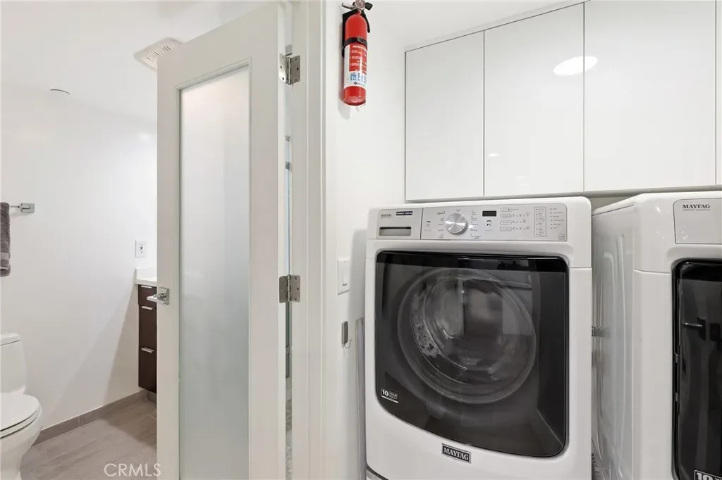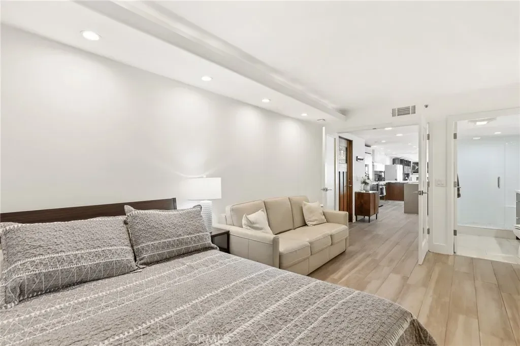The home boasts a luxurious primary suite with a generous walk-in closet, along with a guest bedroom featuring ensuite bath and glass French doors that capture stunning ocean views. Additional highlights include an interior laundry area with full-size washer and dryer, a striking entry door, smooth-finish walls, and meticulous attention to detail throughout.