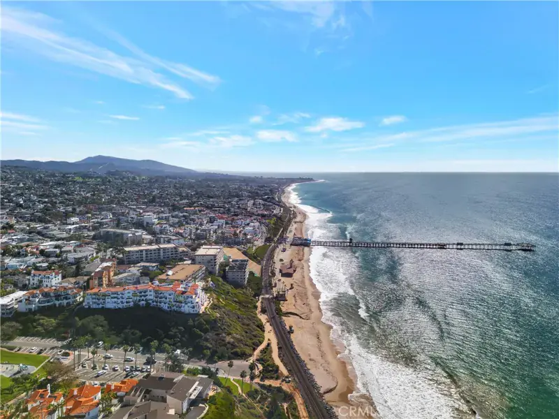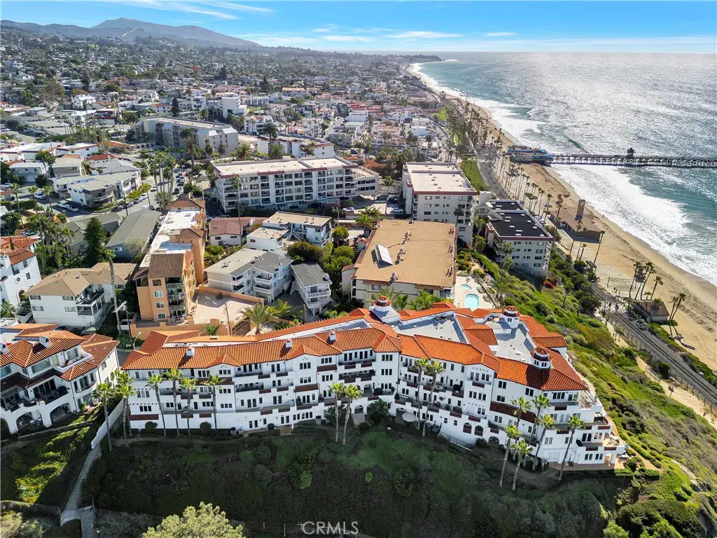 Live just steps to the sand! This Ocean & San Clemente Pier View open concept Vista Pacifica Villas single level condo is perfect for relaxing or entertaining. Large kitchen with granite counters and stainless steel appliances, dining room, and spacious living area make this perfect place to call home. Oversized Primary Bedroom and generous sized Secondary bedroom offer plenty of space. Both bedrooms feature French Doors leading to the Ocean View patio. Additional highlights include two designated parking spaces with electric vehicle charging station and guest parking. Vista Pacifica Villas is a gated community offering secured entry and two elevators. Situated in arguably the worlds greatest climate you will enjoy surfing, downtown shopping, restaurants, parks, festivals, and Southern California’s coastal ambiance all within walking distance.