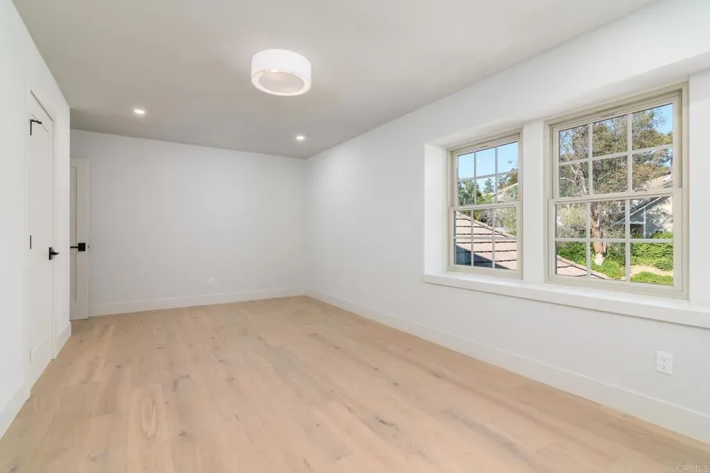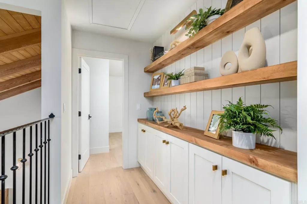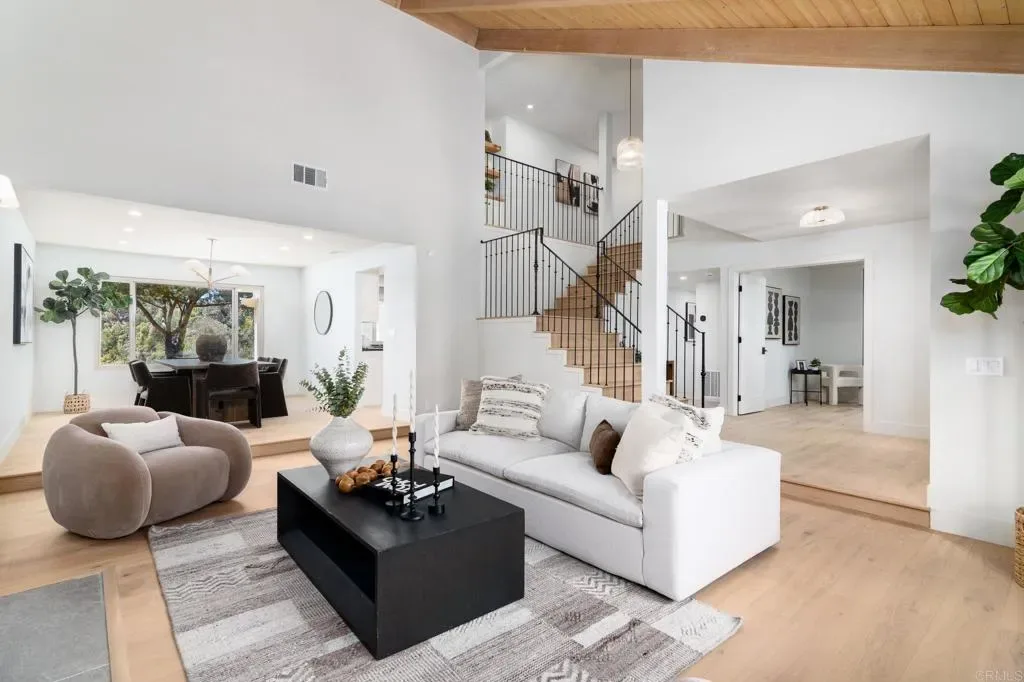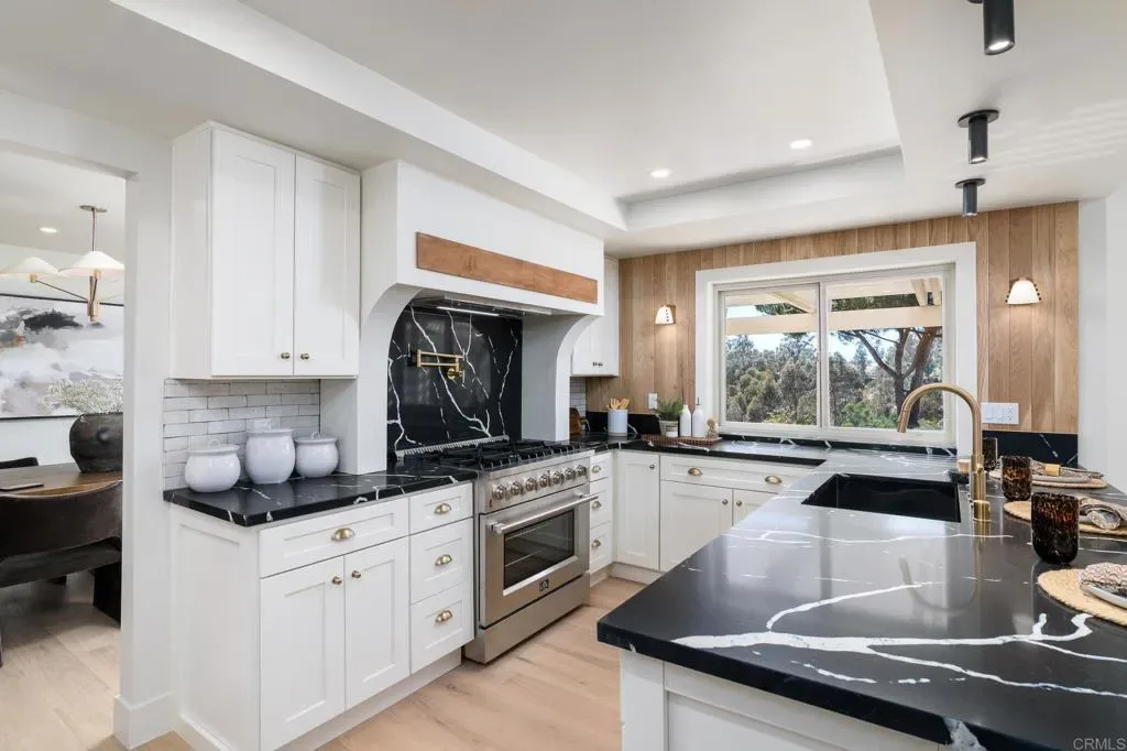 Tucked into a coveted Scripps Ranch corner lot with no neighbors on one side or directly behind, this fully renovated retreat opens to a private nature trail and protected open space—a rare slice of quiet just steps from your door. A grand foyer with iron-railing staircase sets the tone, opening to soaring vaulted wood-beam ceilings, wide-plank engineered hardwood, and a stone fireplace crowned with a striking live-edge wood surround. The chef’s kitchen is pure showstopper: dramatic black quartz with bold white veining, crisp white shaker cabinetry, a glinting gold pot filler, an arched stone range hood, and a professional-grade Forno range made for slow Sunday cooking. The adjoining family room invites lingering with a second fireplace, custom white oak built-ins, shiplap accents, and sliders that pull the outdoors in. Upstairs, the primary suite is its own little hideaway—vaulted ceilings, a third fireplace, and a spa-inspired bath layered in warm oak, honed stone, matte black, globe sconces, a freestanding soaking tub, and a fluted-tile walk-in shower. A deep-blue glossy tile hall bath with walnut vanity and brass pulls adds a jewel-box moment, while a checkered marble laundry room with gold faucet brings charm to the everyday. A main-level bedroom doubles as study or guest retreat. Outside, mature trees, towering palms, and a pergola-shaded patio create a botanical escape. Owned Tesla solar with Powerwall and a three-car garage with epoxy round it all out.