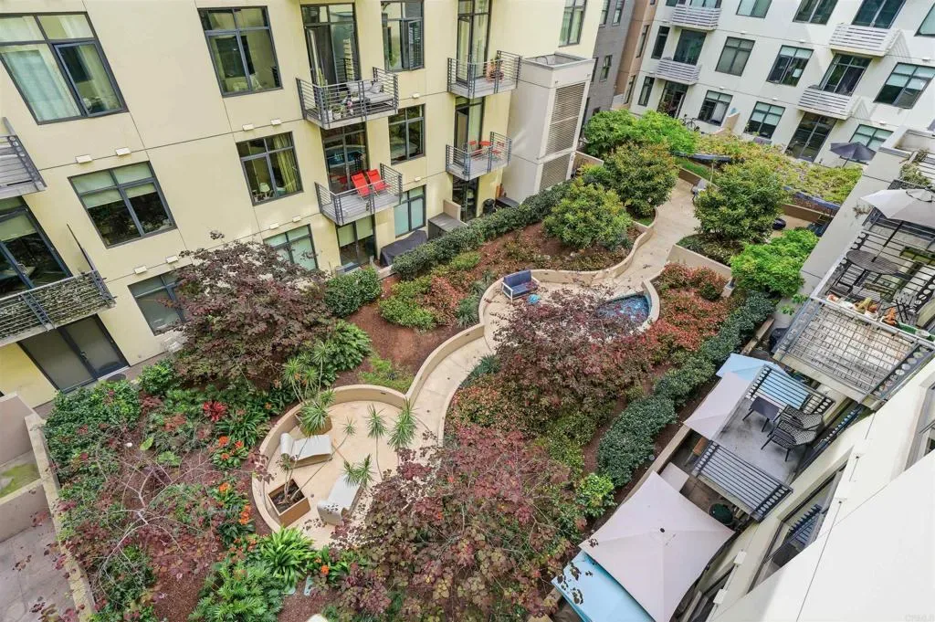 Welcome to Residence #525 at 1050 Island Ave, a beautifully updated 1 bedroom, 2 full bath home in the heart of downtown San Diego. Featuring 11 foot ceilings and oversized windows, this light filled residence offers an open, airy layout with a modern industrial feel and the flexibility to add an additional bedroom. Rich wood flooring and stainless steel appliances create a space that is both refined and functional. Motorized blackout roller shades with smart home integration allow you to control light and privacy effortlessly from your phone, while a smart entry system lets you lock and unlock your front door remotely, adding an extra layer of convenience and security. Step out onto your private balcony overlooking the peaceful interior courtyard, offering a rare sense of calm in the middle of the city. Additional highlights include central AC, in unit washer and dryer, tandem parking, and an oversized private storage unit. Located just two blocks from Petco Park, you are within walking distance to restaurants, shopping, and everything downtown has to offer while still coming home to a quiet, cozy retreat. Residents of M2i enjoy a remodeled fitness center, two lobbies, a lush courtyard, and a rooftop patio with firepit and BBQs. This is downtown living at its best.
