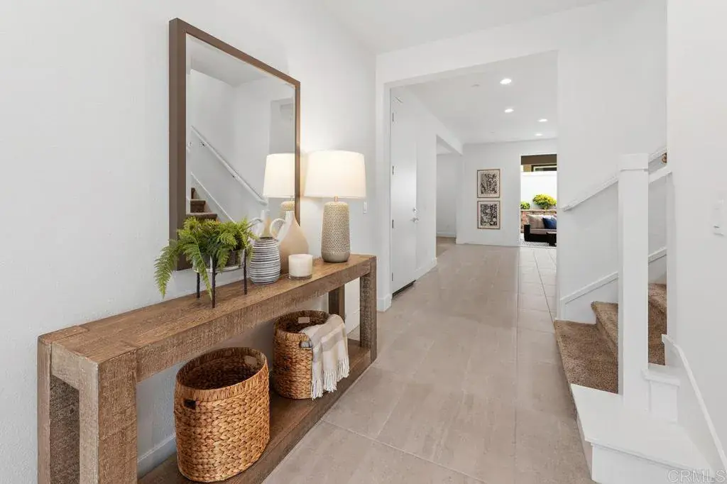 Welcome to this exceptional 4-bedroom, 3.5-bath, two-story residence located in Brio at 3Roots, one of San Diego’s most vibrant master-planned communities. This recently built home offers a rare blend of sophisticated design, modern comfort, and a premier central location. The bright, open-concept floor plan is filled with abundant natural light from expansive windows throughout the home. At the heart of the space is the chef’s kitchen, featuring a large center island, quartz countertops, stainless steel appliances, ample storage, and sleek contemporary finishes—perfect for everyday living, family meals, and entertaining. The dining area opens smoothly into the covered California room, complete with a cozy fireplace and fully retractable sliding doors, creating an effortless indoor-outdoor living experience ideal for gatherings or relaxing evenings. A full bedroom with an en-suite bathroom on the main level provides flexible living options for guests, multigenerational living, or a private home office. Upstairs, a spacious loft offers the perfect bonus space—ideal as a media room, playroom, or study area. The primary suite is a true sanctuary, featuring a spa-style soaking tub, dual vanities, and a generous walk-in closet. Two additional well-sized bedrooms and a bathroom provide the ultimate comfort. 2 car garage with epoxy flooring and tall storage cabinets. Life at 3Roots is designed with families in mind, offering resort-style amenities including two pools, parks and playgrounds, walking trails, and a state-of-the-art fitness center with classes by Fit Athletic. With a strong sense of community, abundant outdoor spaces to explore, and a central San Diego location close to schools, shopping, and dining, this turnkey home delivers the perfect balance of modern living and a family-friendly lifestyle.