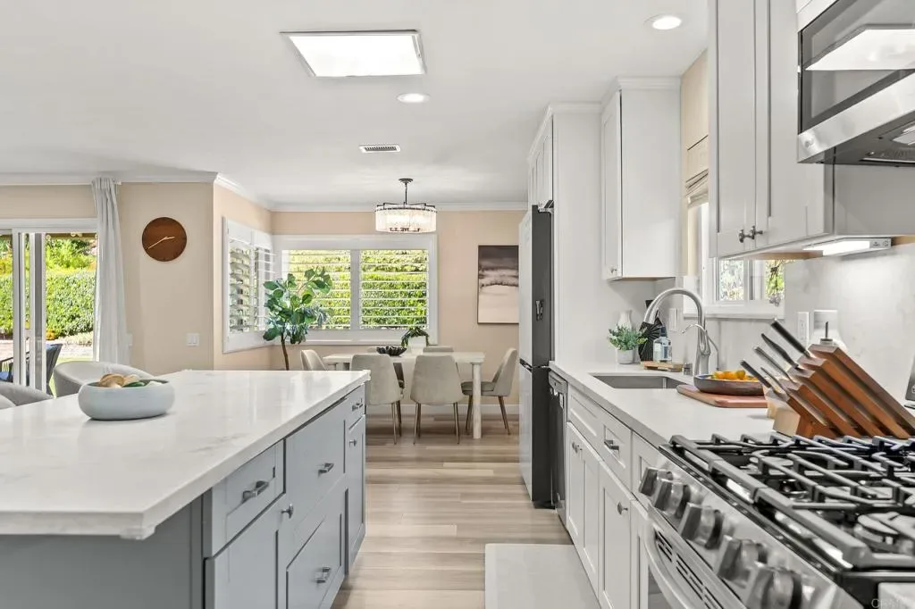Light, bright, and fully updated single-level home in the highly sought-after Rancho Bernardo Greens. Recently renovated with a new kitchen, beautifully updated bathrooms, new hardwood flooring, and a new electrical panel ready for future solar—offering a true move-in ready opportunity. The functional layout includes 3 bedrooms, 2 remodeled baths, and a detached bonus office (equipped with AC and hardwired high speed internet ) — ideal for remote work, creative space, or added flexibility. The spacious living room features a cozy fireplace, abundant natural light, and seamless indoor-outdoor flow through sliding doors to the backyard. The open-concept kitchen is designed for both everyday living and entertaining, flowing effortlessly into the dining and family areas. It showcases modern finishes, new cabinetry, stainless steel appliances, and a large island that serves as the natural gathering space. The owner especially loves the openness of the kitchen and the direct views out to the backyard, creating a strong connection between indoor and outdoor living. The private backyard offers west-facing mountain views, mature landscaping, and fruit trees including kumquat, lemon, and apple—an inviting setting for relaxing or hosting. Set on an approximately 10,000 sq ft lot in an all-ages community (not 55+), this home offers excellent walkability—just minutes to the Rancho Bernardo Swim & Tennis Club and a nearby preschool. Residents enjoy access to pools, tennis, pickleball, fitness center, playgrounds, and community events, with golf, shopping, dining, trails, and major employers all close by. Located within the award-winning Poway Unified School District.