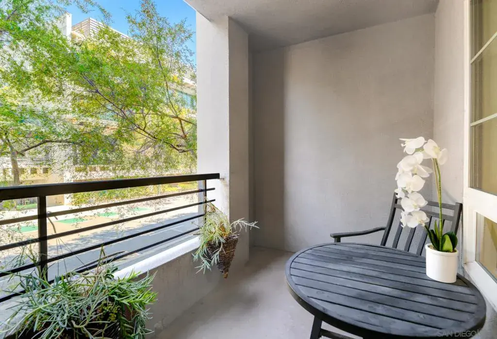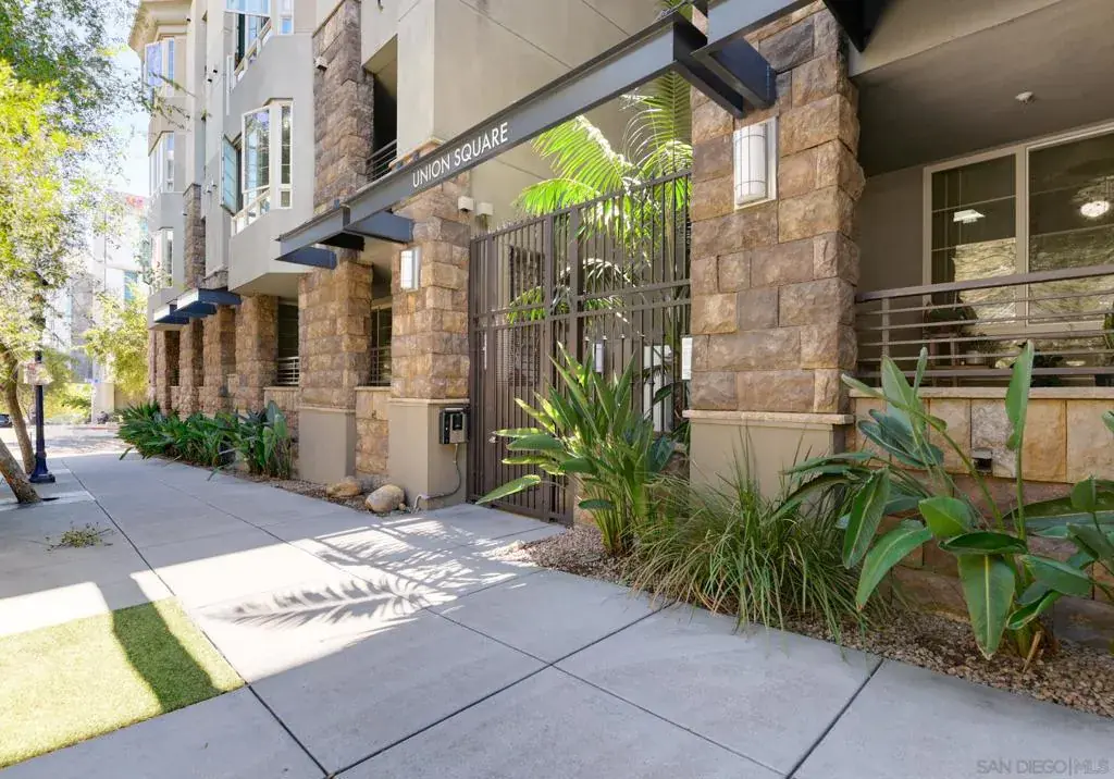 Welcome to Union Square at Broadway, a VA-approved community that combines the convenience and excitement of city living in a neighborhood-like setting. This spacious end-unit condo offers two-bedrooms and two-bathrooms in a rarely available layout with private patio area. The great room boasts expansive bay windows that look out on breathtaking mature trees. This property is located in a prime location to enjoy all Downtown has to offer, just steps to San Diego City College and within walking distance of Petco Park and the future East Village Green (Phase 1 Opening in 2025). Enjoy a kitchen that is both stylish and functional with sleek granite countertops and Whirlpool appliances, with upgraded gas range and built-in microwave. Sleek wood-look tile flooring runs throughout the kitchen, living room, and hallway, while both bedrooms have plush carpeting. The primary bedroom with ensuite features two closets and custom Closet World built-ins. The secondary bedroom features mirrored closet doors and looks out on the community’s tropical landscaping. Both bathrooms include shower/tub combos, granite countertop vanities, and upgraded modern light fixtures. Residents of Union Square enjoy access to an impressive array of amenities, including onsite management, a fully equipped gym with sauna and jacuzzi, BBQ areas, a party room, community EV charging stations, and an active social committee that hosts year-round events such as a St. Patrick’s Day party and an End of Summer social. Don’t miss this rare opportunity to own in one of San Diego’s most desirable downtown communities. This unit has two dedicated tandem parking spaces with storage cage in the community’s secure gated parking garage. Other unit features include in-unit laundry, central heating and air conditioning and ceiling fans in both bedrooms and living room. This condo is in the ideal location for commuters and those who utilize public transit, providing easy access to the Trolley and freeways. The area also plays host to frequent community events like the East Village Block Party, Oktoberfest, Taste of East Village, and the annual Tree Lighting and Holiday Market. Enjoy top rated restaurants right in your neighborhood, including Calle, Cowboy Star, Lola 55, IZOLA, Bar Kamon, Sovereign Thai, Bottle Rocket and more.