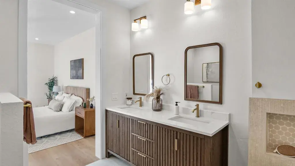 Welcome to this beautifully remodeled townhome in the sought-after Las Floras community of Bernardo Heights, offering the privacy and feel of a single-family home. This exceptional 3-bed/2.5-bath features a rare layout with two spacious primary suites—one conveniently located on the first floor and a second oversized suite upstairs, ideal for multigenerational living or hosting guests. The heart of the home is the stunning kitchen, showcasing honed Perla Venata countertops and seamless connectivity to the dining and living areas—perfect for both everyday living and entertaining. Luxury vinyl plank flooring flows throughout, complemented by soaring vaulted ceilings that enhance the home’s open, airy feel. Spa-inspired bathrooms feature double vanities in both primary suites, creating a true retreat-like experience. Upstairs, an additional flex room provides the perfect setting for a home office, gym, or creative retreat. Modern upgrades include a newer HVAC system and furnace, ensuring year-round comfort. Enjoy outdoor living with a charming front courtyard entry and a private rear patio, ideal for relaxing or entertaining. Residents of Bernardo Heights enjoy access to the Bernardo Heights Community Center, offering a true country club lifestyle with pools, spa, tennis courts, fitness room, billiards, newly added pickleball and basketball courts, and elegant lounge areas. Ideally located just a short walk to Lucido Park, Bernardo Heights Middle School, and Rancho Bernardo High School, this home blends luxury, convenience, and lifestyle in one of North County’s most desirable communities.