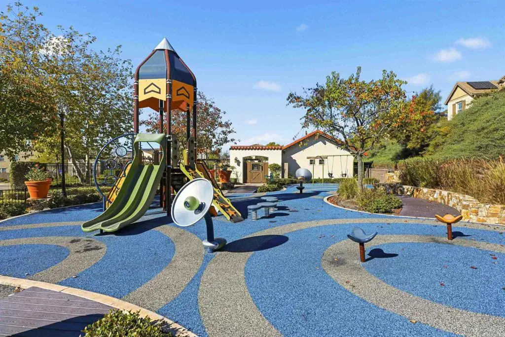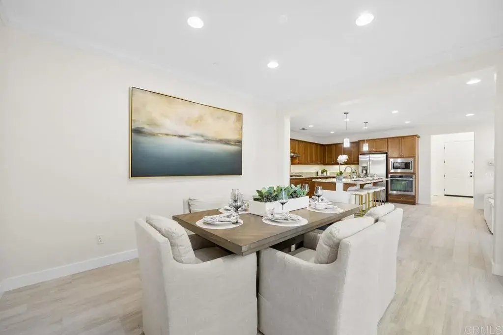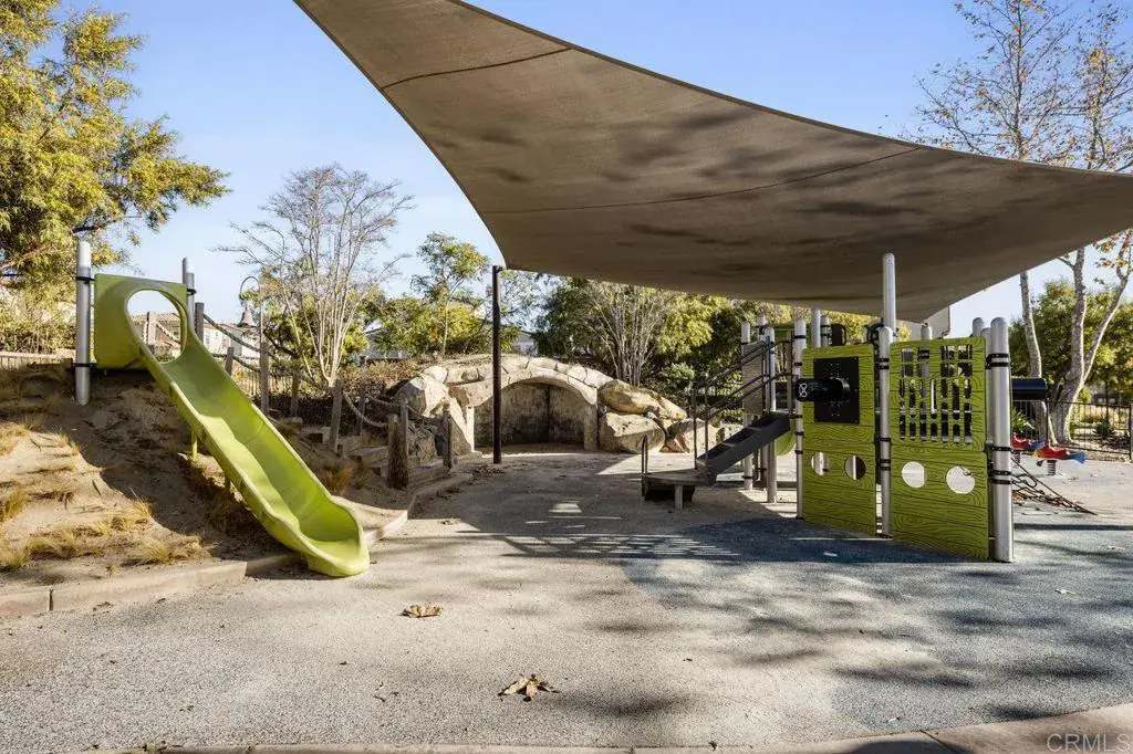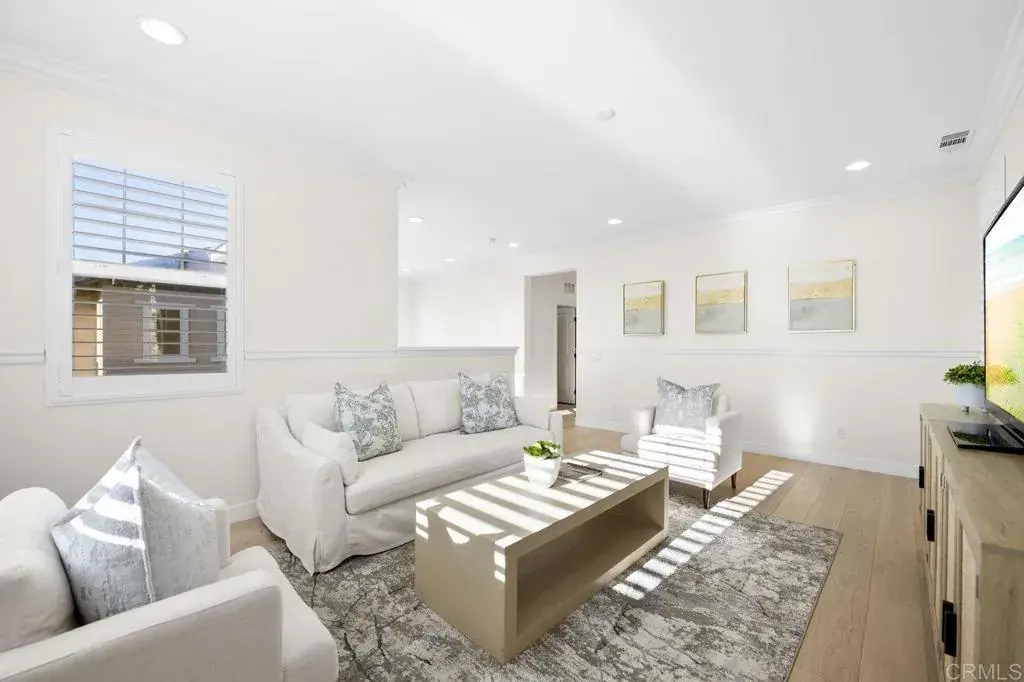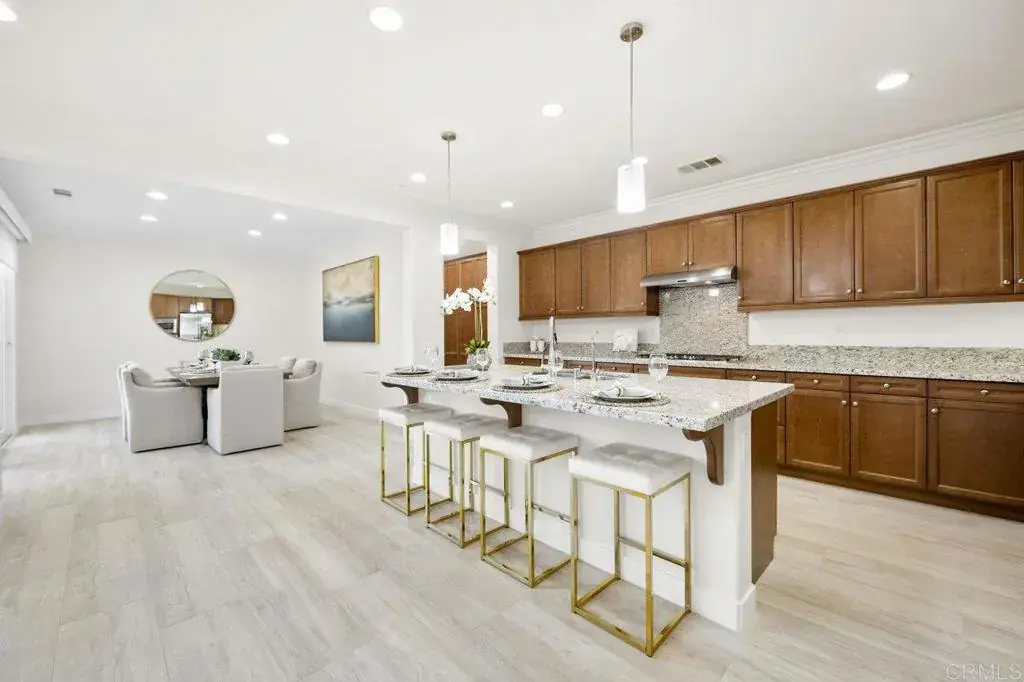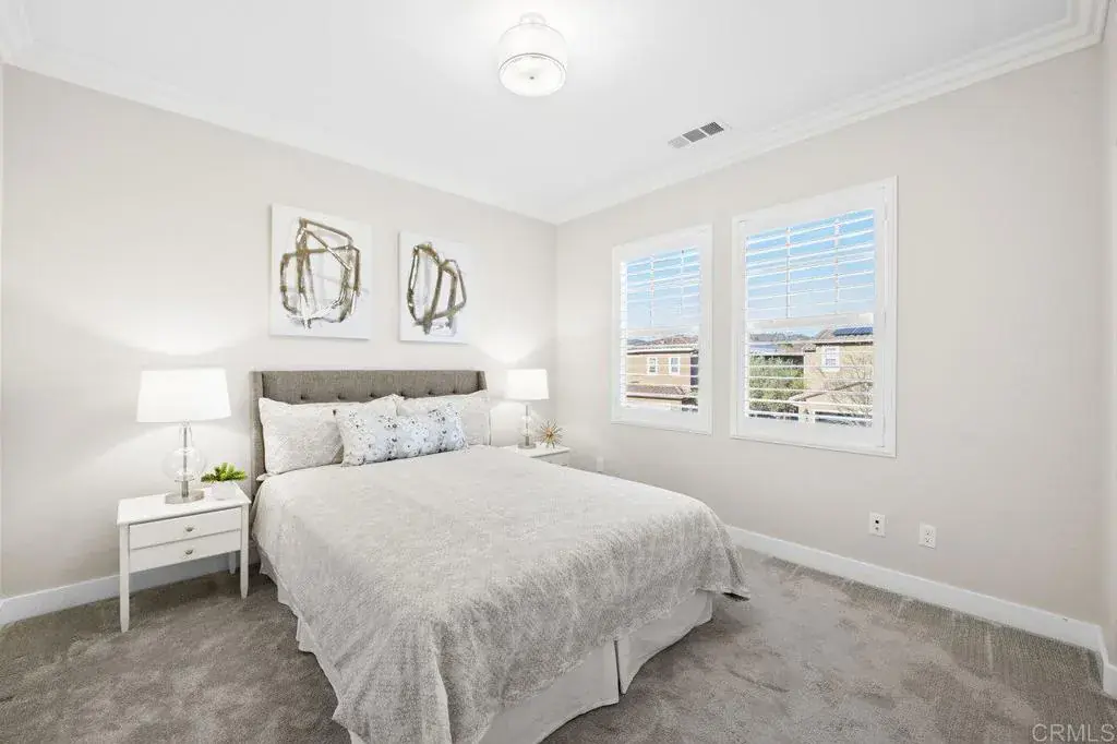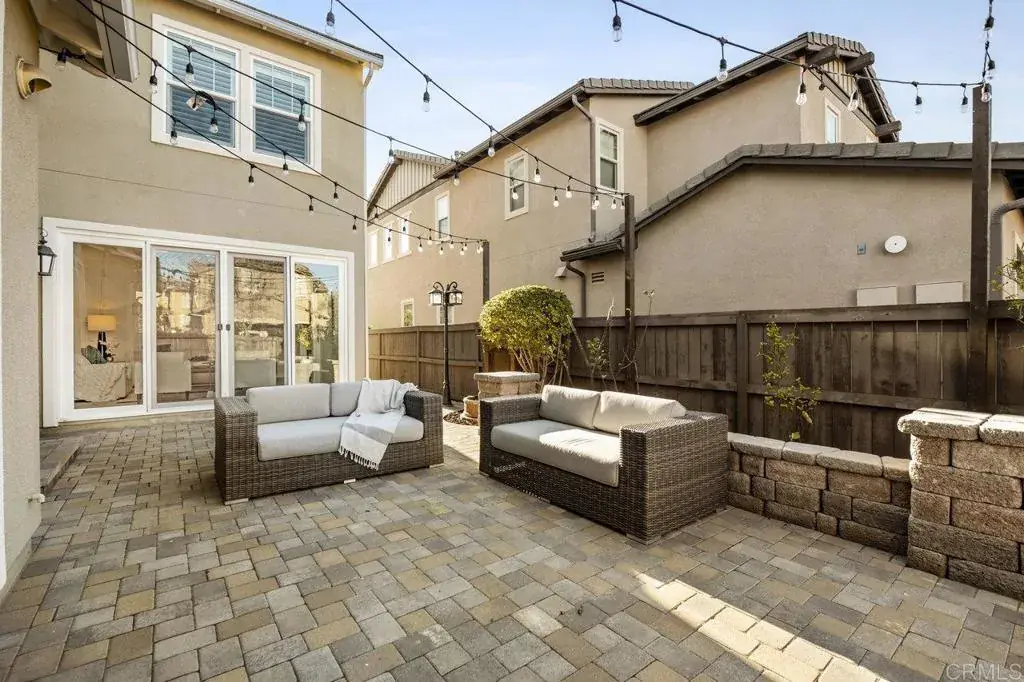 This stunning 4-bedroom, 3-bathroom Carrillo home in the heart of Del Sur seamlessly blends charming cottage-style architecture with modern upgrades, including owned solar. The open floorplan is designed for effortless living and entertaining, with features that make every space inviting and functional. The Great Room welcomes you with a gas fireplace, plantation shutters, and crown molding that extends throughout the entire home. Sliding glass doors open to the courtyard, creating a perfect space for indoor/outdoor entertaining. The chef’s kitchen is equipped with granite countertops, stainless steel appliances, a 5-burner gas stovetop, and a large island with barstool seating. A spacious dining room adjacent to the kitchen opens to the courtyard. A desirable first-floor bedroom offers a cozy bay window nook and an adjacent bathroom featuring a walk-in glass shower, making it ideal for guests or multi-generational living. The two-story foyer adds a touch of grandeur as you move through the home. Upstairs, a versatile loft provides the perfect space for relaxing, working from home, or a playroom. The spacious primary suite is flooded with natural light from numerous west-facing windows, offering picturesque sunset views. The spa-like en-suite bathroom boasts dual vanities, an oversized soaking tub, a spacious walk-in closet, and a large glass-and-tile shower with a built-in bench. Two additional upstairs bedrooms are bright and generously sized, sharing a bathroom with a dual vanity and shower/tub combination. The upstairs laundry room adds convenience with a sink, ample cabinetry, and a large linen closet. Recent upgrades include new wood flooring added throughout the majority of the home. The attached garage is equipped with a 240-volt outlet for EV charging, adding to the home’s modern conveniences. The family-friendly Del Sur community offers an unbeatable lifestyle with 14 parks, 11 resident-only pools, a dog park, and numerous walking trails. You’re just a short stroll from three community parks and the Del Sur Town Center, which features Target, Starbucks, restaurants, shopping, gyms, groceries, and more. Located in the award-winning Poway Unified School District, top-rated schools—Del Sur Elementary, Oak Valley Middle School, and Del Norte High School—are all within two miles. Outdoor enthusiasts will appreciate the area’s 28 golf courses and four hiking reserves all located within 10 miles. With easy access to CA-56 and I-15 freeways, this home offers the perfect combination of convenience and tranquility in one of San Diego’s most desirable neighborhoods.