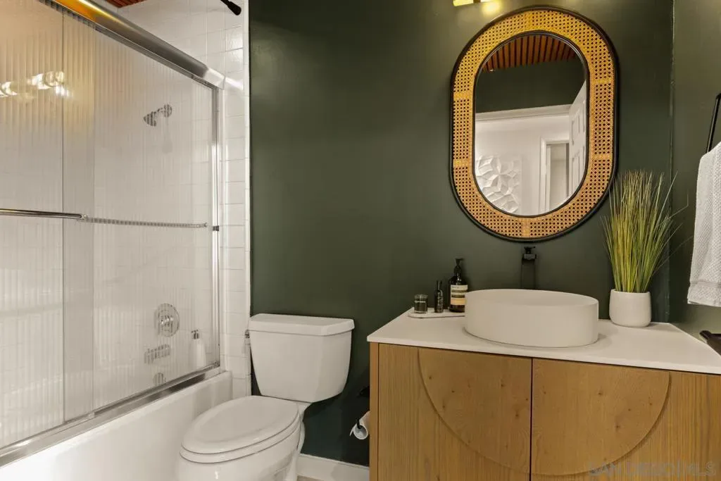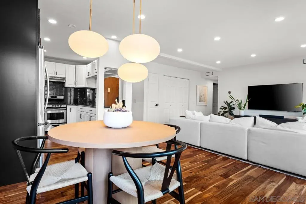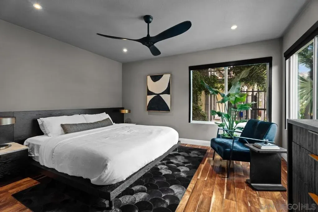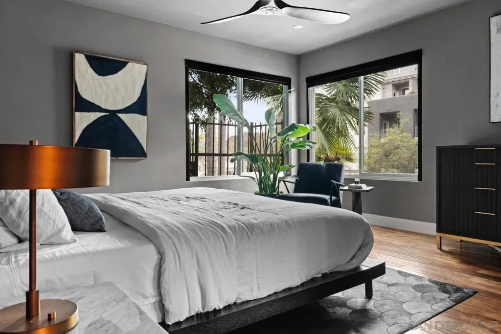 Tucked into the heart of Cortez Hill at Park View, this southwest-facing corner residence offers a rare blend of natural light, privacy, and design. Perched above a quiet, tree-lined street, the home is wrapped in windows and filled with light throughout the day, creating an open, inviting feel that’s hard to find downtown. Just moments from Little Italy and Balboa Park, the location delivers both walkability and a more residential setting. Extensively updated, the home features acacia wood floors, smooth-coated walls, and curated finishes throughout. The living and dining areas are anchored by custom wood slat accent walls and designer lighting, including a Crate & Barrel chandelier and CB2 fixtures, adding warmth and architectural interest. The kitchen offers granite countertops, stainless steel appliances, and a seamless connection to the main living space. Both bedrooms are generously sized, including a primary suite with an ensuite bath, ample closet space, and motorized blackout shades. Bathrooms have been tastefully remodeled with a clean, modern design. Additional highlights include a large in-unit laundry room, two side-by-side parking spaces with EV charging, and a brand new HVAC system. New windows and southwest exposure enhance natural light throughout. Smart home features include Philips Hue lighting, smart switches, Nest thermostat, and SimpliSafe security system. The home blends thoughtful design with modern convenience in one of downtown San Diego’s most desirable neighborhoods.