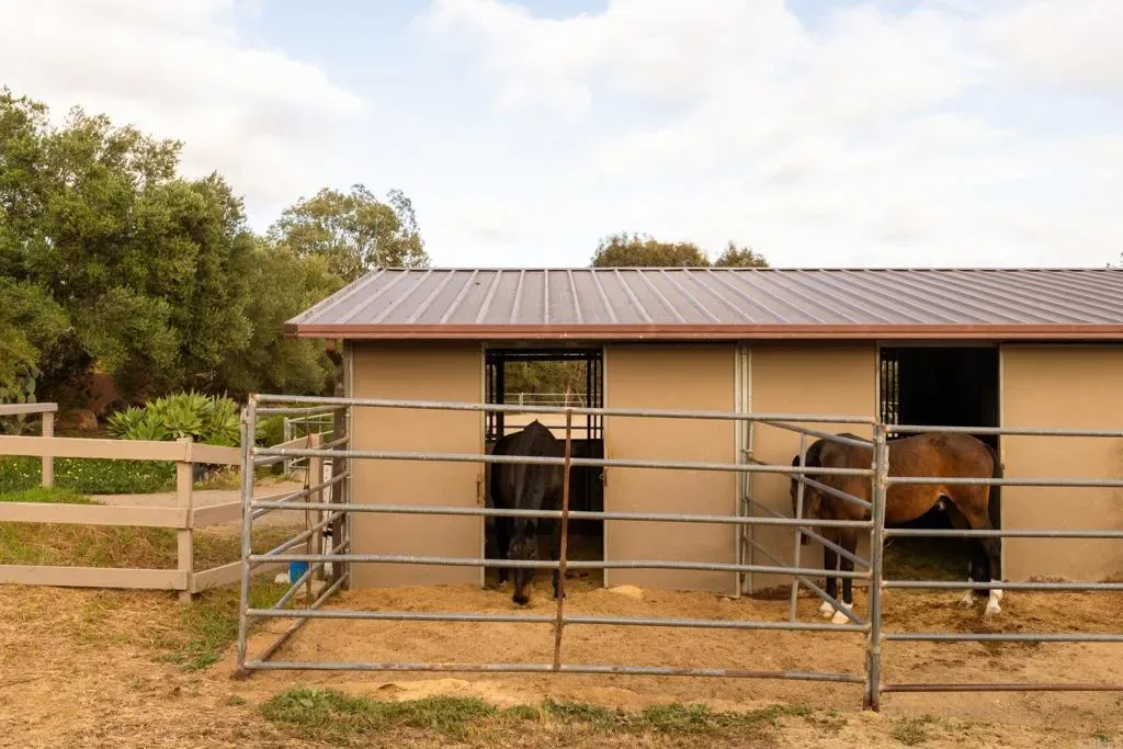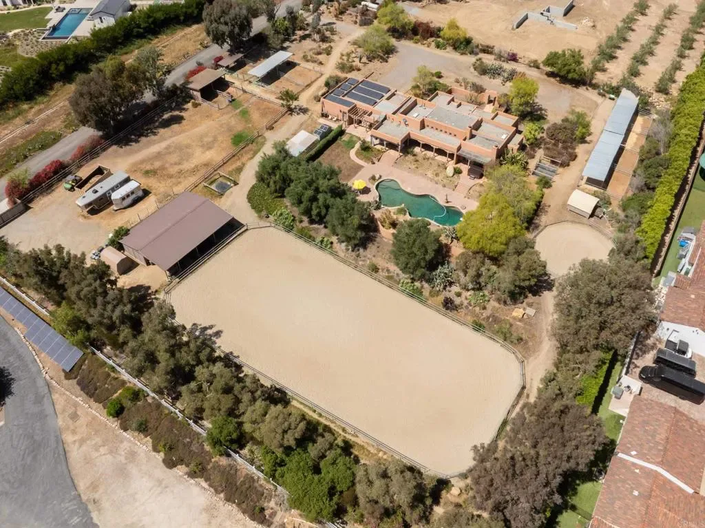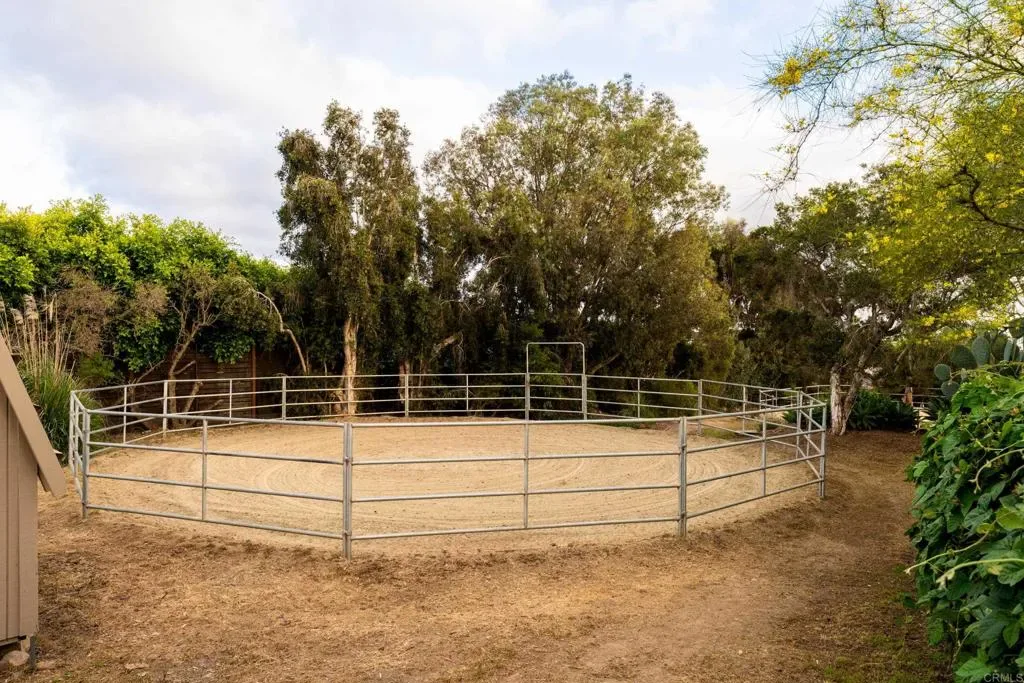 Located within a desirable enclave along Artesian Road, this Santa Fe-style ranch estate sits on a flat and usable 2.44-acre parcel, offering a balanced blend of timeless architecture, outdoor living, and functional equestrian amenities. The property is thoughtfully arranged with two separate gated entrances—one dedicated to the residence and the other to the equestrian facilities—allowing for both privacy and ease of operation. The 5-bedroom, 4-bathroom home features warm, inviting interiors, including a kitchen with a built-in breakfast nook designed for everyday living and casual gathering, flowing naturally into comfortable entertaining spaces. The landscape has been designed to complement and honor the architecture, creating a sense of cohesion and ease throughout the property. Outdoor living includes a pool and spa, BBQ area, and outdoor shower, with multiple areas to relax and unwind. A rooftop deck provides a unique vantage point, offering ocean views on clear days. Owned solar adds efficiency, and an attached ADU allows for flexibility for guests, staff, or extended family. Equestrian facilities are practical and well laid out, with a 4-stall barn supported by 10 corrals, tack rooms, wash racks, and cross ties. The property also includes an arena, round pen, and pasture, supporting a variety of riding disciplines and equestrian lifestyle needs. Direct access to miles of county-maintained horse trails, including effortless connection to the Lusardi Creek County Preserve, creates a seamless experience between the property and the surrounding landscape. Surrounded by open space and designed with a sense of harmony in mind, the property offers a grounded and authentic approach to ranch living—where architecture, land, and lifestyle come together in a quiet, understated way.