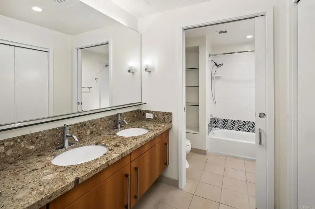 Welcome to ICON Residence 201, a rarely available two-bedroom, two-bath home offering an exceptional indoor-outdoor lifestyle in the heart of Downtown San Diego. The expansive approximately 860 sq ft private patio, overlooking the serene interior courtyard, provides a true outdoor sanctuary—ideal for entertaining, relaxing, or enjoying San Diego’s year-round climate. This light-filled residence features floor-to-ceiling windows, ceramic tile flooring in the main living areas, and a freshly painted interior for a crisp, move-in-ready feel. Additional highlights include an in-unit washer and dryer, two tandem parking spaces, and the second-floor location offers the convenience of direct walk-out access to the street, delivering a townhome-style living experience. ICON residents enjoy an impressive collection of amenities, including a sky lounge with views into Petco Park and sweeping panoramas of San Diego Bay, Coronado, and beyond. The sky lounge is equipped with grills, heat lamps, and beautifully appointed seating areas, perfect for entertaining or unwinding. The building also features a stylish community room with a full kitchen, dining area, TV lounge, and work zones, along with a fully equipped fitness center. ICON is professionally managed with secured entry and lobby attendants, offering comfort, convenience, and peace of mind. Ideally located in the vibrant East Village, this home is just steps from Petco Park, acclaimed restaurants, the Central Library, and the Gaslamp Quarter, placing the best of downtown living right outside your door. Urban living paired with an exceptionally rare outdoor retreat—this is Downtown San Diego living at its finest.
