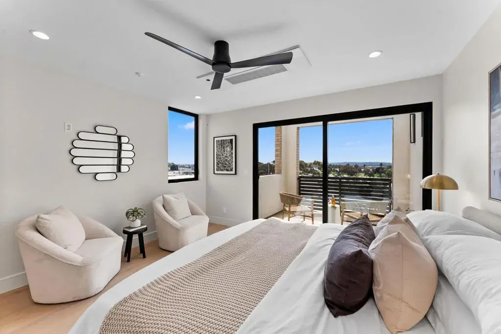 4210 Tonopah is a new construction luxury townhome in the Bay Park neighborhood of San Diego. Enjoy breathtaking views of Mission Bay, sunsets and fireworks from the living room and primary bedroom! Features an open concept layout with designer touches, including a large kitchen island, solid surface quartz countertops / matching backsplash, and custom inset European slab cabinets. Brushed gold kitchen hardware, Thermador appliances, custom glass wall, floating iron staircases, engineered hardwood floors, and stylish lighting fixtures. The space is bathed in natural light from oversized windows and floor-to-ceiling balcony slider doors. Spacious bedrooms all with on-suite bathrooms. The large private garage is set up for EV charging and home comes with owned solar. Comes with an upgraded home warranty (2-10 home warranty). Seller willing to provide optional balcony enclosure. Great central location provides easy access to transit, local dining, coffee shops, and the expansive Mission Bay Park, a 4,600-acre oasis perfect for biking, jogging, picnicking, and water sports. The expanded Blue Line (light rail), short walk away, connects to Downtown, UCSD, SDSU, UTC, Sorrento Mesa and beyond. Less than a 10 minute bike ride to USD. Project is VA approved.