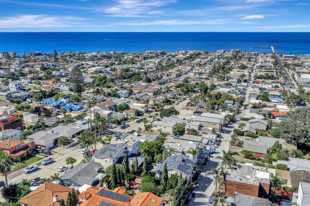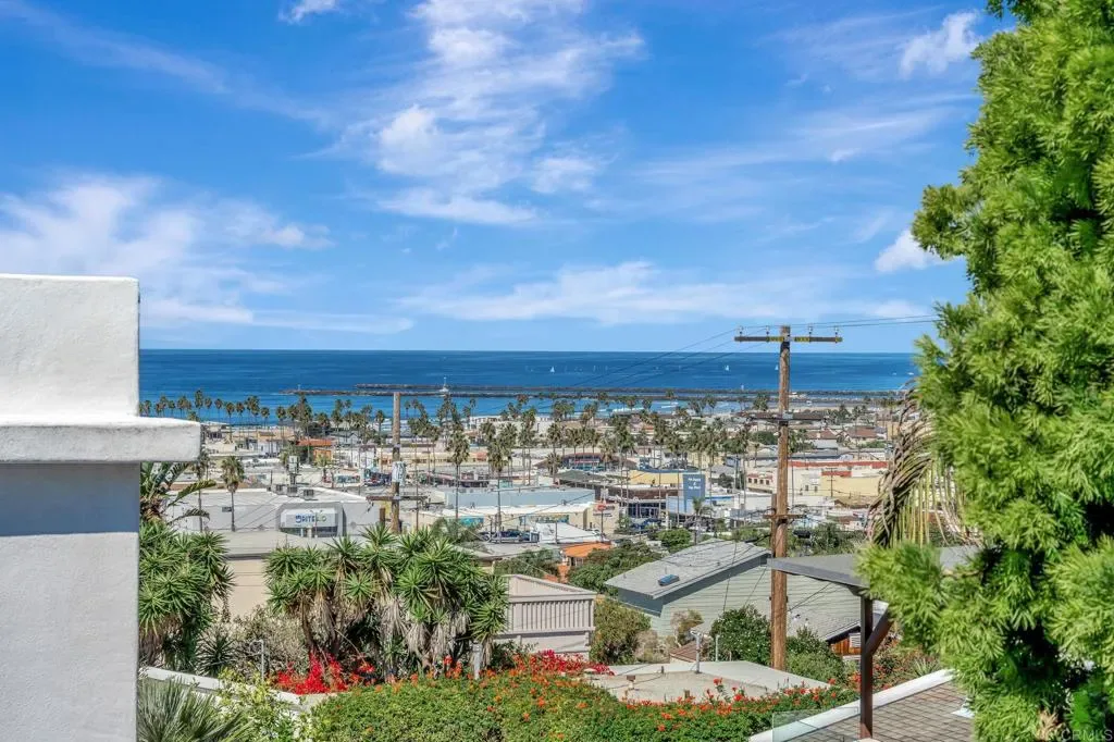 Experience coastal luxury perched overlooking the Pacific Ocean from your two beautifully designed homes. The front home features approximately 2,358 sq. ft., boasting four bedrooms and three bathrooms with a flexible floor plan ideal for multi-generational living or work-from-home flexibility. Upstairs, the expansive primary suite offers serenity and refined comfort, complete with a soaking tub, steam shower, dual sinks, abundant bespoked storage abounds, two primary closets, a dedicated shoe closet, and additional cabinetry. A bonus office/bedroom sits nearby, creating the perfect retreat for relaxation or productivity and more custom built-ins. The main level highlights two bedrooms and two baths, a spacious great room, and a chef’s kitchen equipped with a GE Profile column refrigerator and freezer, Viking range and hood, marble countertops, double-drawer Fisher & Paykel dishwasher, and 25-lb. ice maker. Meticulous craftsmanship is evident throughout — from the true inset cabinetry and hidden drawers to the thoughtful appliance garages and designer finishes. Luxury continues outdoors with a saltwater pool and spa surrounded by new turf and 2024 drainage upgrades. A dry bar with dual beverage refrigerators in the great room and a full laundry room open directly to this resort-style space. Three gas fireplaces—including one at the foot of the primary bed—add warmth and ambiance throughout the home. The front home is powered by 40 solar panels (PPA approx. $0.20/kWh, transferrable) and this home is served by private parking in a two-car garage, plus an additional one-car garage. At the rear of the property, on the alley, is a separate two-bedroom, one-bath second home (approx. 899 sq. ft.) above a three-car garage, currently leased for $4,395/month. This second home features a newly remodeled bathroom (2025) and refreshed kitchen (2024) with new counters, sink and more. Updated garages include brand-new epoxy floors, slat walls, stainless sinks, and custom storage, with an EV charger serving the main residence. Additional highlights include a movie/playroom beneath the main home, ideal for guests or family entertainment, and an ocean-view deck above the front garage showcasing stunning sunsets. Recent upgrades include a 2025 water heater with recirculating system, as well as a whole-home water softener and filtration system. This exceptional dual-home property combines craftsmanship, design, and effortless coastal living — a rare opportunity in Ocean Beach.