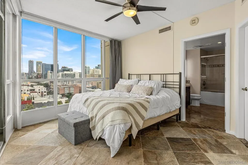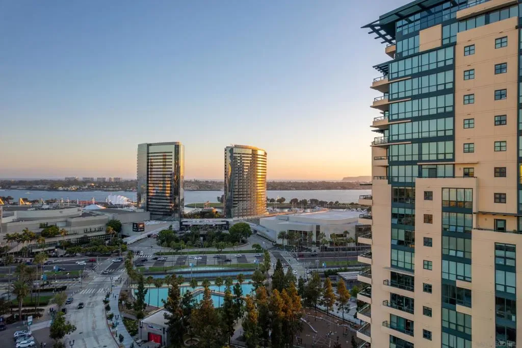 Spacious & bright corner unit with incredible panoramic views of downtown San Diego from every window! Located in the heart of the marina district, this chic condo in Horizon South has been updated with travertine flooring, a stone-surround gas fireplace, premium light fixtures, ceiling fans, and new modern doors and hardware. The well-designed layout includes a versatile den, perfect for a home office, fitness area, or creative studio, offering flexible space to fit your lifestyle. The kitchen boasts stainless steel appliances, crisp white cabinetry, and granite counters. The primary bedroom features a large walk-in closet, blackout shades, access to the patio, and an ensuite bath with a shower/tub combo and plenty of cabinet storage. Additional features include a second bathroom with a walk-in shower and an in-unit laundry closet large enough to accommodate a full-sized washer and dryer! Enjoy beautiful sunset views of Downtown from your spacious, private patio. Resident amenities include a gym, pool, spa, conference room, lounge, updated lobby area, storage unit, EV chargers, guest parking, and 24-hour gated security. Horizon residents enjoy year-round socials for the entire community. Ideally situated just steps to The Rady Shell and adjacent to a dog park, with easy access to Padres games at Petco Park and year-round concerts without the hassle of downtown parking. You’re also moments from Seaport Village, the Gaslamp Quarter, Little Italy, and San Diego’s incredible calendar of events.