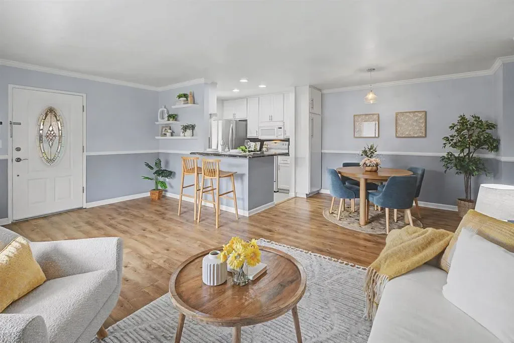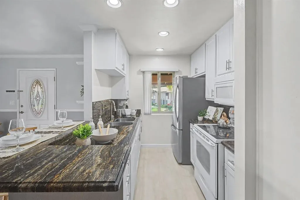 Beautiful private corner-unit condo located on a quiet cul-de-sac street. Enjoy mountain views from your spacious balcony. Mission Trails Regional Park is right across the street with over 8000 acres for the best hiking in San Diego. For more hiking choices you are close to Cowles Mountain and Lake Murray.This 2 bedroom, 1 bath condo offers 880 sq. ft of bright single-level living with the entire unit upstairs on one level and no one above you. Enjoy a covered entry once inside experience the spacious great room setting. The upgraded kitchen features granite countertops, white shaker-style cabinets, a step-up breakfast counter, stainless steel sink, dishwasher, microwave, electric cooktop stove, and stainless steel refrigerator. The bathroom also includes granite countertops. Interior highlights include upgraded vinyl plank flooring, some laminate. Wall A/C units in each room, ceiling fans and a whole house fan to keep things cool. Heat source. Recently installed new bathroom light fixtures. Exceptional storage includes attic storage with drop-down ladder access, built-in drawers, a closet safe, and additional storage in the carport area below. The water heater is located inside the unit and all appliances are electric. Additional features include an upgraded front door with oval stained glass, wrought iron security door, and two-car tandem parking directly below the unit. Plenty of guest parking on the street by your unit. Enjoy the grassy area in front of the unit and a short walk to the community pool, BBQ area, picnic area, and playground. Great opportunity for first-time buyers, downsizers, or investors looking for a well-located home with privacy, views, and convenient community amenities. This San Carlos gem is move in ready, meticulously maintained and offers the perfect balance of modern living and outdoor lifestyle! DONT MISS OUT!