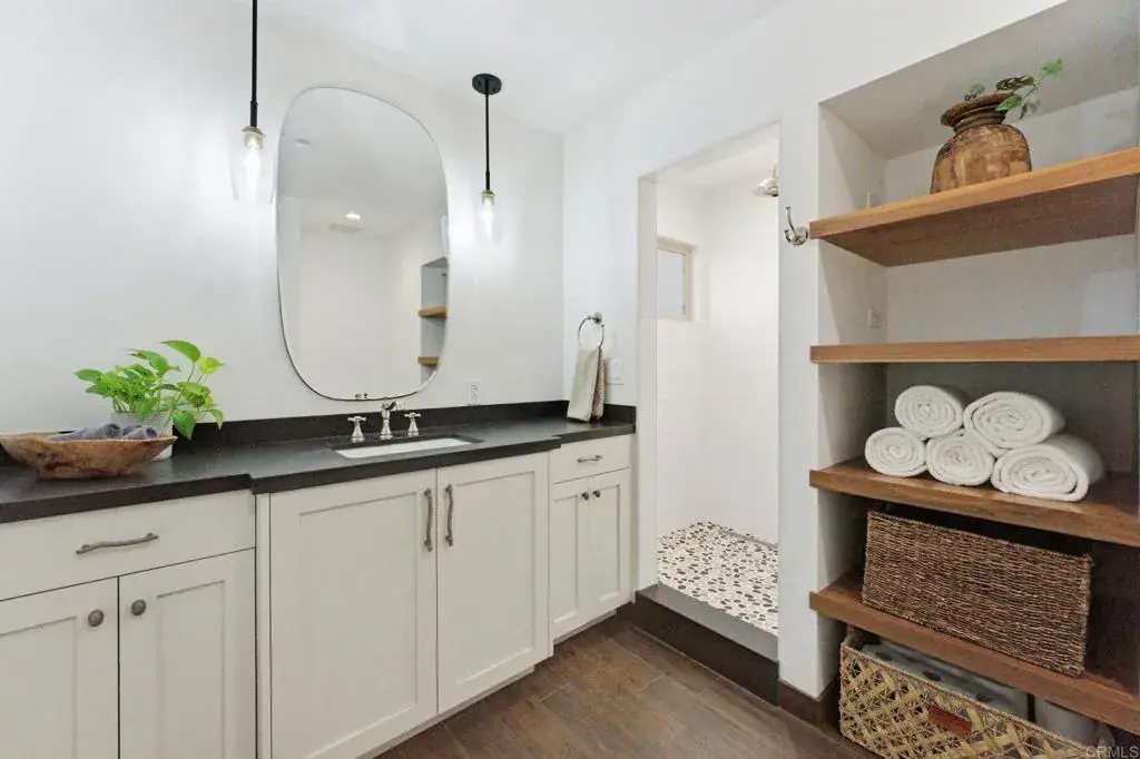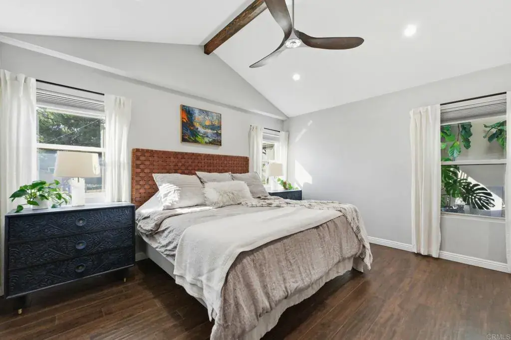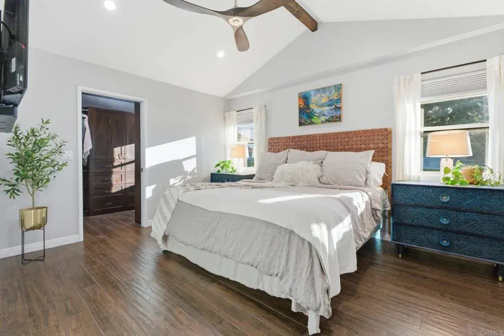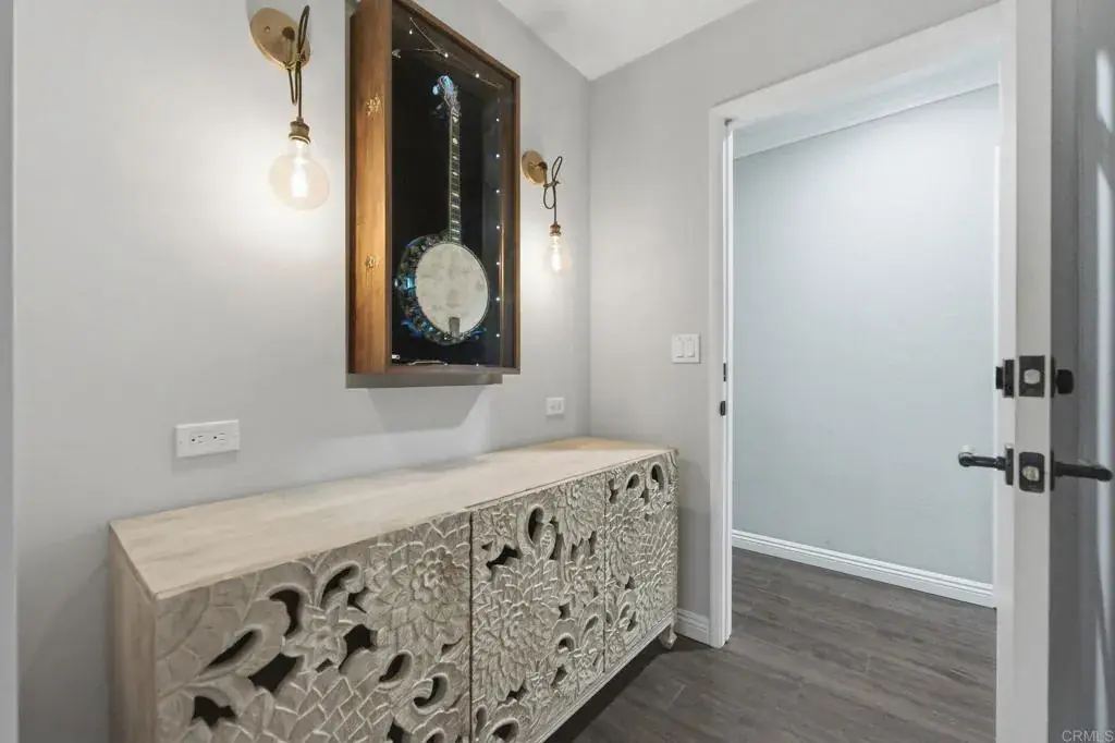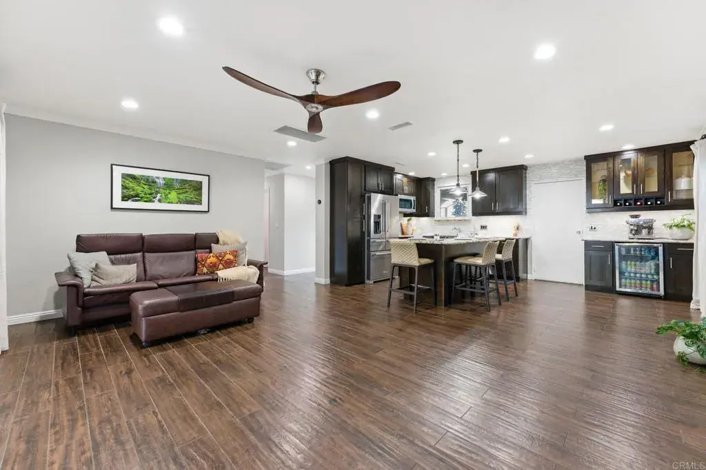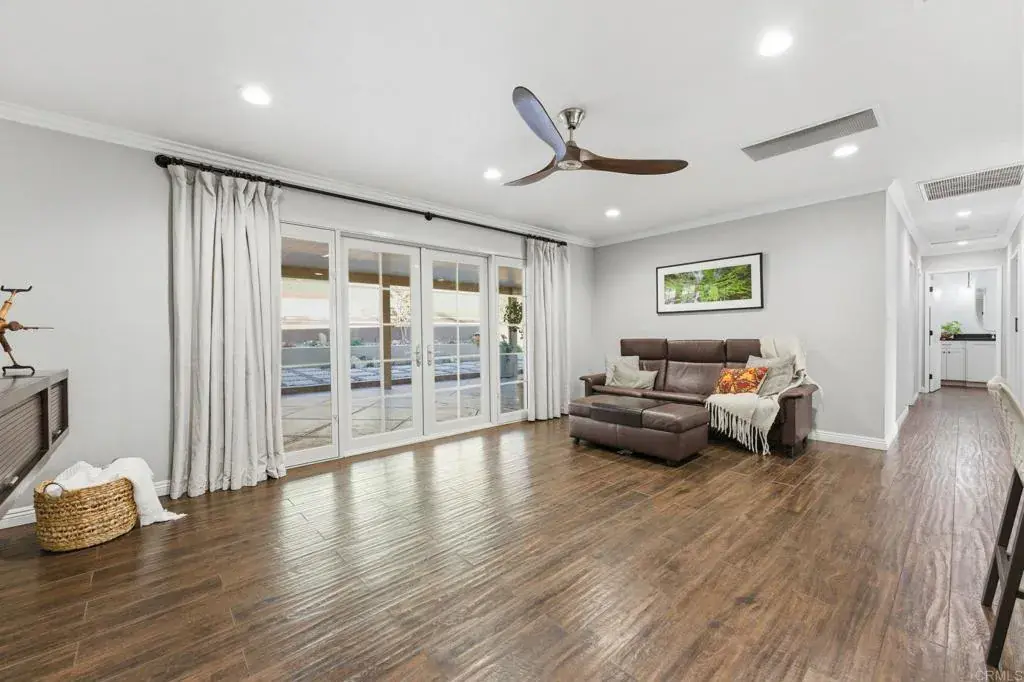 Offered for the first time in over twenty years, this meticulously maintained, turnkey 3-bedroom, 2-bath home was thoughtfully remodeled and expanded in 2019, creating a luxurious primary suite, two full bathrooms, and enhanced storage including a large linen closet. Every detail reflects pride of ownership and high-end craftsmanship throughout. The expansive primary suite is a private retreat featuring vaulted ceilings, a generous walk-in closet, soundproof insulation, motorized window shades, and a spa-inspired bathroom. Enjoy a jetted soaking tub with ceiling-mounted tub filler, a separate oversized shower with handmade Spanish tile and a stunning amazonite slab, designer vanity, and a washlet. The second bathroom also includes a washlet for added comfort. Solid wood doors with premium hammered brass hardware complement durable wood-grain porcelain tile flooring that flows seamlessly throughout the home. Exceptional curb appeal welcomes you with a Santa Fe–style stucco exterior, zero-maintenance front yard, custom stonework at the entry, and Bluetooth-controlled, color-changing landscape lighting. The converted garage offers a spacious and versatile bonus room with real hardwood flooring and ample storage, while still retaining a dedicated motorcycle garage. This home is loaded with modern upgrades, including two solar systems for a virtually nonexistent electric bill (one fully paid off with an extended inverter warranty), new HVAC with APCO whole-house air purifier (2019), QuietCool whole-house fan, tankless water heater, upgraded plumbing throughout and to the main line, whole-house water softener, reverse osmosis drinking water filtration, UV and impact-resistant window film, and electrical pre-wiring for both a Tesla charger and a jacuzzi. Step into the fully fenced private backyard and enjoy serene views of Cowles Mountain. The outdoor space features mature avocado, peach, and cherry trees, drought-tolerant landscaping, an extended covered patio with electrical, a large modern fire pit with a dedicated underground gas line, natural gas BBQ connection, French drain, custom front gate for added security, and a large storage shed. Ideally located just one block from San Carlos Park with ball fields and playground, and offering convenient freeway access near parks, hiking trails, shopping, and excellent schools. This is a wonderful neighborhood with a strong sense of community — a rare opportunity to own a truly exceptional home.