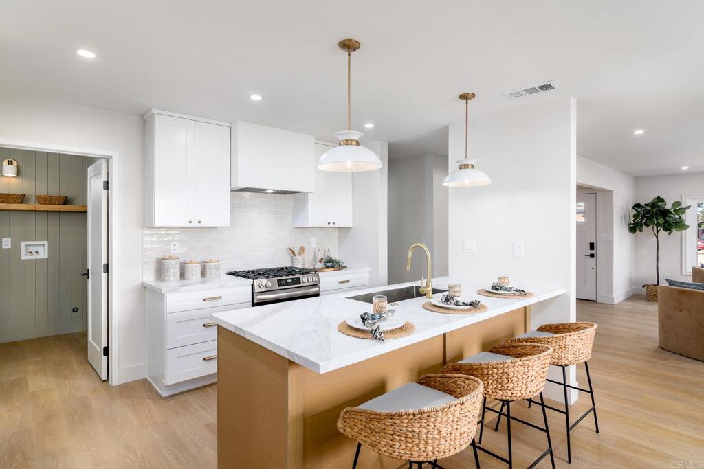 Beautifully remodeled, move-in-ready home in the heart of central San Diego. This light-filled residence offers a thoughtfully designed open layout featuring two fireplaces, luxury waterproof vinyl plank flooring, and seamless indoor-outdoor flow. The stunning kitchen is the centerpiece of the home, showcasing crisp cabinetry, quartz countertops, a custom hood feature, designer tile backsplash, stainless steel appliances, and a large island with seating, perfect for everyday living and entertaining alike. The spacious family room opens to the backyard and is anchored by a second fireplace, creating a warm and inviting space for gatherings or relaxing evenings. The primary suite provides a peaceful retreat with a beautifully updated en-suite bathroom featuring a dual-sink vanity, modern finishes, and a standalone shower. Additional bedrooms are well-proportioned and bright, and the updated hall bathroom features a stylish tub and shower combination. A dedicated color drenched laundry room with custom shelving adds everyday convenience with style. Outside, enjoy a landscaped, low-maintenance yard with turf, mature trees, and private patio space ideal for entertaining or unwinding. Solar panels add energy efficiency and long-term savings. Centrally located with easy access to shopping, dining, parks, and major commuter routes, this home offers modern comfort, thoughtful upgrades, and true move-in-ready appeal.