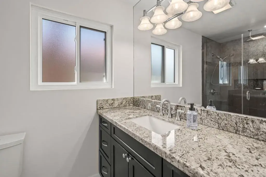 Tucked away at the end of a quiet cul-de-sac with peaceful mountain views, this beautifully updated 4-bedroom, 2.5-bath split-level home is filled with natural light and offers privacy, comfort, and a true sense of home the moment you arrive. Renovated top to bottom and truly move-in ready, major systems have already been taken care of, including a new AC, furnace, and water softener system. The main living and dining areas are flooded with sunlight from newer windows, creating an open, airy feel that flows effortlessly into the stylish kitchen—perfect for both everyday living and entertaining. The kitchen features soft-close cabinetry, quartz countertops, a large island with pendant lighting and counter-height seating, a glass tile backsplash, oversized stainless steel sink, stainless steel appliances, and a gas cooktop. Downstairs, the spacious great room is ideal for relaxing or gathering, with luxury vinyl flooring, a stone gas fireplace, and a convenient half bath. Sliding doors open to a covered patio and lush, low-maintenance backyard—perfect for indoor-outdoor living and easy entertaining. Direct access to the garage adds everyday convenience. Upstairs, you’ll find four bedrooms and two remodeled bathrooms. The light-filled primary suite enjoys mountain views, a walk-in closet, new sliding doors, and an updated ensuite bath featuring an oversized step-in shower with overhead waterfall fixture, vanity, fixtures, and lighting. The hall bath has also been remodeled with a tub, vanity, fixtures, and lighting. A bonus oversized storage space accessed through the primary bedroom offers incredible flexibility for storage, a hobby room, or future customization. Located in the highly acclaimed Poway Unified School District (Sunset Hills Elementary, Black Mountain Middle, and Mt. Carmel High School), with no HOA and no Mello-Roos, and just minutes from shopping, dining, schools, and easy access to SR-56, I-5, and I-15. This is the kind of home that checks every box—updated, bright, private, and perfectly located. A must-see in person… you’re going to feel right at home.