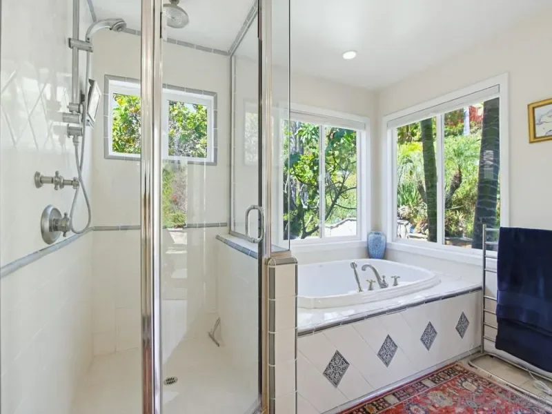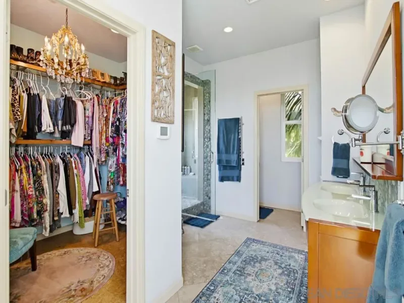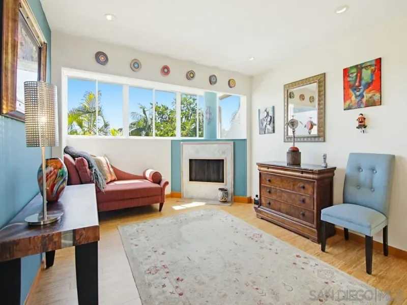 Extraordinary Indoor-Outdoor Retreat with Ocean, Bay & City Views. Perched at the end of a coveted Bay Park cul-de-sac, this remarkable multi-level home is a rare fusion of artist’s sanctuary, tropical retreat, and entertainer’s dream — where every room, inside and out, is a space worth savoring. The living room commands attention with soaring cathedral beam ceilings and a dramatic floor-to-ceiling wall of glass that pours southwestern light and sweeping views into the heart of the home. The chef’s kitchen is nothing short of spectacular: custom basketweave tile backsplash, solid Brazilian Rainforest granite island and counters, a custom circular glass dining area on the island, deep walk-in pantry, and premium appliances including a Wolf six-burner range top, KitchenAid, and Bosch. The adjacent dining room features a custom copper fireplace surround with raised hearth — an unforgettable focal point for intimate gatherings. A den or cozy sitting area off the kitchen offers a second fireplace and view windows, while the main-level bath impresses with a deep Kohler soaking tub, shower, and glass door opening directly to the spa and aviary garden. Slide open the full wall-of-glass system and let the private backyard oasis become part of your living space — alfresco entertaining at its absolute finest. Two-zone air conditioning throughout. Seller owned solar panels. (see supplemental) The bedrooms level offers three rooms, including one currently used as a private theater room with its own bath and private French door entry from a serene fountain courtyard. Two additional bedrooms share a well-appointed bath. The primary suite commands the entire top level, offering breathtaking water and city views, a generous deck perfect for watching shimmering firework displays, a skylight, and a dressing room with chandelier. The en-suite bath features a stunning rock-floor shower with a second door that opens wide to frame the west-facing water views. The backyard is pure magic— a meditative retreat centered around an aviary, spa, and water feature fountain. When it’s time to entertain, the space transforms into a full outdoor kitchen and bar: Viking grill, food warmer, dual outdoor burners, kegerator, and TV. Orange, lemon and fig trees complete this private paradise. Artist fabricated special outside fire pit. Views, breezes, and beauty at every turn — this home is truly one of a kind.